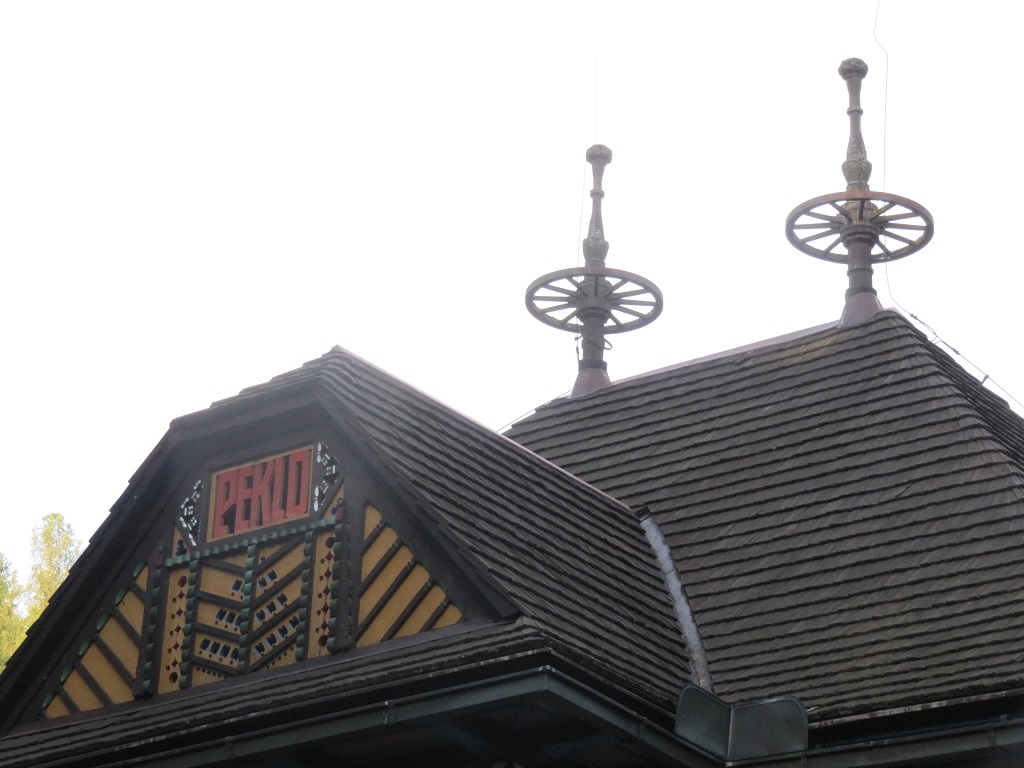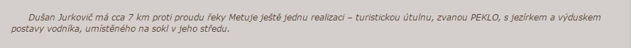 Dušan Jurkovič má cca 7 km proti proudu řeky Metuje ještě jednu realizaci – turistickou útulnu, zvanou PEKLO, s jezírkem a výduskem postavy vodníka, umístěného na sokl v jeho středu.