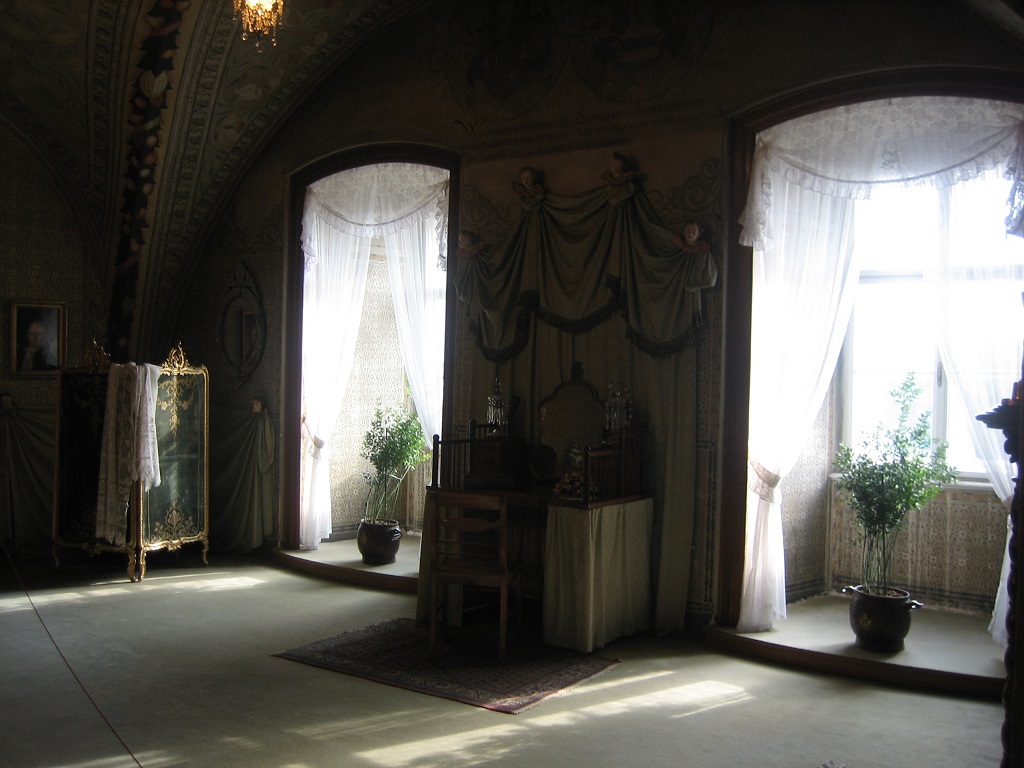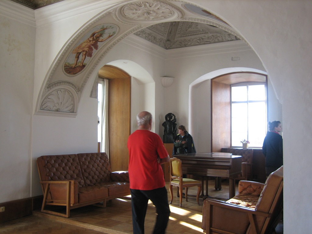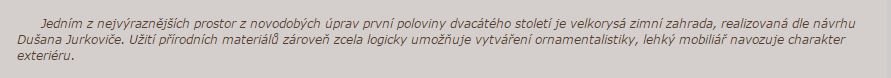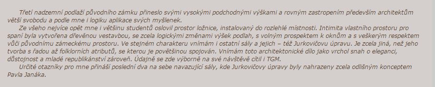 Ze všeho nejvíce opět mne i většinu studentů oslovil prostor ložnice, instalovaný do rozlehlé místnosti. Intimita vlastního prostoru pro spaní byla vytvořena dřevěnou vestavbou, se zcela logickými změnami výšek podlah, s volným prospektem k oknům a s veškerým respektem vůči původnímu zámeckému prostoru. Ve stejném charakteru vnímám i ostatní sály a jejich – též Jurkovičovu úpravu. Je zcela jiná, než jeho tvorba s řadou až folklorních atributů, se kterou je povětšinou spojován. Vnímám toto architektonické dílo jako vrchol snah o eleganci, důstojnost a mladé republikánství zároveň. Údajně se zde výborně na své návštěvě cítil i TGM.