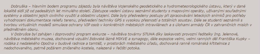 Dobruška – hlavním bodem programu zájezdu byla návštěva Vojenského geodetického a hydrometeorologického ústavu, který v dané lokalitě sídlí již od padesátých let minulého století. Zástupce vedení ústavu seznámil studenty s mapovými operáty, užívanými souřadnými systémy a oblastmi jejich civilního využití a oblastmi utajení. Dále byly předvedeny postupy při zpracovávání leteckých snímků pro potřeby vyhodnocení dokumentace reliefu terenu, předvedení techniky GPS s vysokou přesností a totálních soustav. Dále se studenti seznámili s tvorbou virtuálních modelů simulace ochrany VIP osob v konkrétních městských intravilánech a s úlohami armády ČR v zahraničních misích v předmětném oboru.