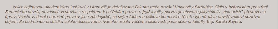 Velice zajímavou akademickou institucí v Litomyšli je detašovaná Fakulta restaurování Univerzity Pardubice. Sídlo v historickém prostředí Zámeckého návrší, novodobá vestavba s respektem k potřebám provozu, jejíž kvality potvrzuje absence jakýchkoliv „domácích“ přestaveb a úprav. Všechny, docela náročné provozy jsou zde logické, se svým řádem a celková kompozice těchto vjemů dává návštěvníkovi pozitivní dojem. Za podrobnou prohlídku celého doposavad užívaného areálu vděčíme laskavosti pana děkana fakulty Ing. Karola Bayera.