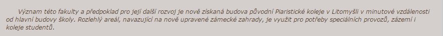 Význam této fakulty a předpoklad pro její další rozvoj je nově získaná budova původní Piaristické koleje v Litomyšli v minutové vzdálenosti od hlavní budovy školy. Rozlehlý areál, navazující na nově upravené zámecké zahrady, je využit pro potřeby speciálních provozů, zázemí i koleje studentů.
