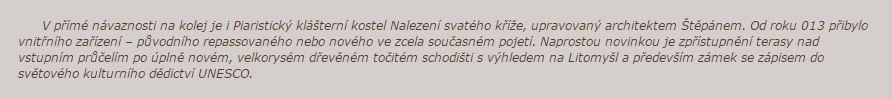 V přímé návaznosti na kolej je i Piaristický klášterní kostel Nalezení svatého kříže, upravovaný architektem Štěpánem. Od roku 013 přibylo vnitřního zařízení – původního repassovaného nebo nového ve zcela současném pojetí. Naprostou novinkou je zpřístupnění terasy nad vstupním průčelím po úplně novém, velkorysém dřevěném točitém schodišti s výhledem na Litomyšl a především zámek se zápisem do světového kulturního dědictví UNESCO.