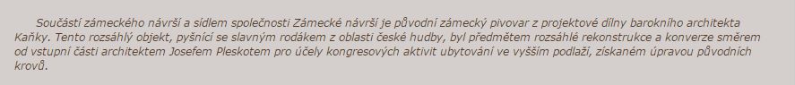 Součástí zámeckého návrší a sídlem společnosti Zámecké návrší je původní zámecký pivovar z projektové dílny barokního architekta Kaňky. Tento rozsáhlý objekt, pyšnící se slavným rodákem z oblasti české hudby, byl předmětem rozsáhlé rekonstrukce a konverze směrem od vstupní části architektem Josefem Pleskotem pro účely kongresových aktivit ubytování ve vyšším podlaží, získaném úpravou původních krovů.