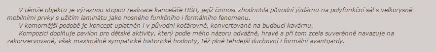 V témže objektu je výraznou stopou realizace kanceláře HŠH, jejíž činnost zhodnotila původní jízdárnu na polyfunkční sál s velkorysně mobilními prvky s užitím laminátu jako nosného funkčního i formálního fenomenu.
