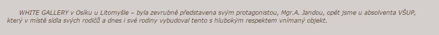 WHITE GALLERY v Osíku u Litomyšle – byla zevrubně představena svým protagonistou, Mgr.A. Jandou, opět jsme u absolventa VŠUP, který v místě sídla svých rodičů a dnes i své rodiny vybudoval tento s hlubokým respektem vnímaný objekt.