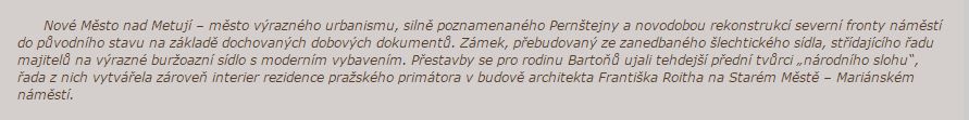 Nové Město nad Metují – město výrazného urbanismu, silně poznamenaného Pernštejny a novodobou rekonstrukcí severní fronty náměstí do původního stavu na základě dochovaných dobových dokumentů. Zámek, přebudovaný ze zanedbaného šlechtického sídla, střídajícího řadu majitelů na výrazné buržoazní sídlo s moderním vybavením. Přestavby se pro rodinu Bartoňů ujali tehdejší přední tvůrci „národního slohu“, řada z nich vytvářela zároveň interier rezidence pražského primátora v budově architekta Františka Roitha na Starém Městě – Mariánském náměstí.