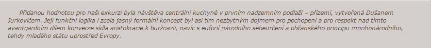 Přidanou hodnotou pro naši exkurzi byla návštěva centrální kuchyně v prvním nadzemním podlaží – přízemí, vytvořená Dušanem Jurkovičem. Její funkční logika i zcela jasný formální koncept byl asi tím nezbytným dojmem pro pochopení a pro respekt nad tímto avantgardním dílem konverze sídla aristokracie k buržoazii, navíc s euforií národního sebeurčení a občanského principu mnohonárodního, tehdy mladého státu uprostřed Evropy.