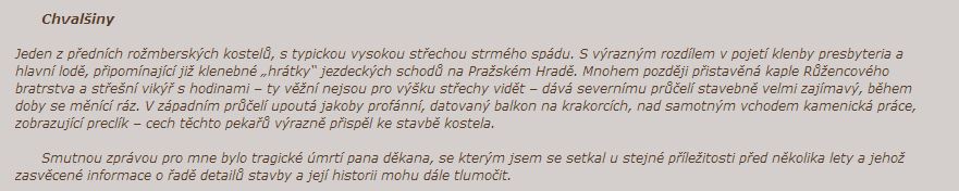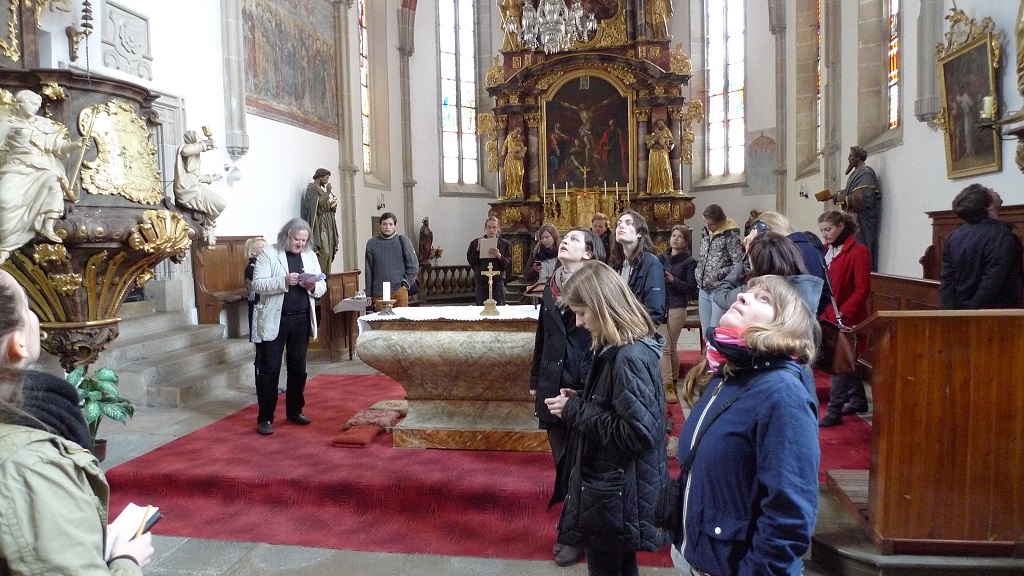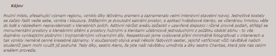 Poutní místo, přesahující význam regionu, vzniklo díky léčivému prameni a zaznamenalo velmi intenzivní stavební rozvoj. Jednotlivé kostely se začaly řadit vedle sebe, vznikla i klauzura. Stěžejním je dvoulodní sakrální prostor, s aplikací hvězdicové klenby, se včleněnou hmotou věže do lodě s následkem nepravidelnosti v klenebních polích. Aditivní nárůst areálu způsobil v uzavřené dispozici i různé úrovně podlah, střídají se monumentální prostory s klenebními sítěmi s prostory hutnými s klenbami učebnicově jednoduchými z počátku období slohu - to vše doplněno vynikajícími plošnými i trojrozměrnými výtvarnými díly. Respektovali jsme vyslovené přání minimálně fotografovat v interierech a tak vznikly neméně cenné kresebné záznamy. V současnosti obývá areál několik řádových sester, jejichž vstřícnost vůči návštěvě našich studentů jsem mohl využít již podruhé. Tedy díky, sestro Aleno, že jste naši návštěvu umožnila a díky sestro Charitas, která jste nás celým areálem provedla.