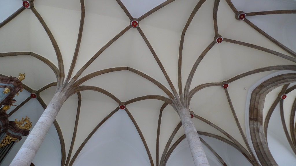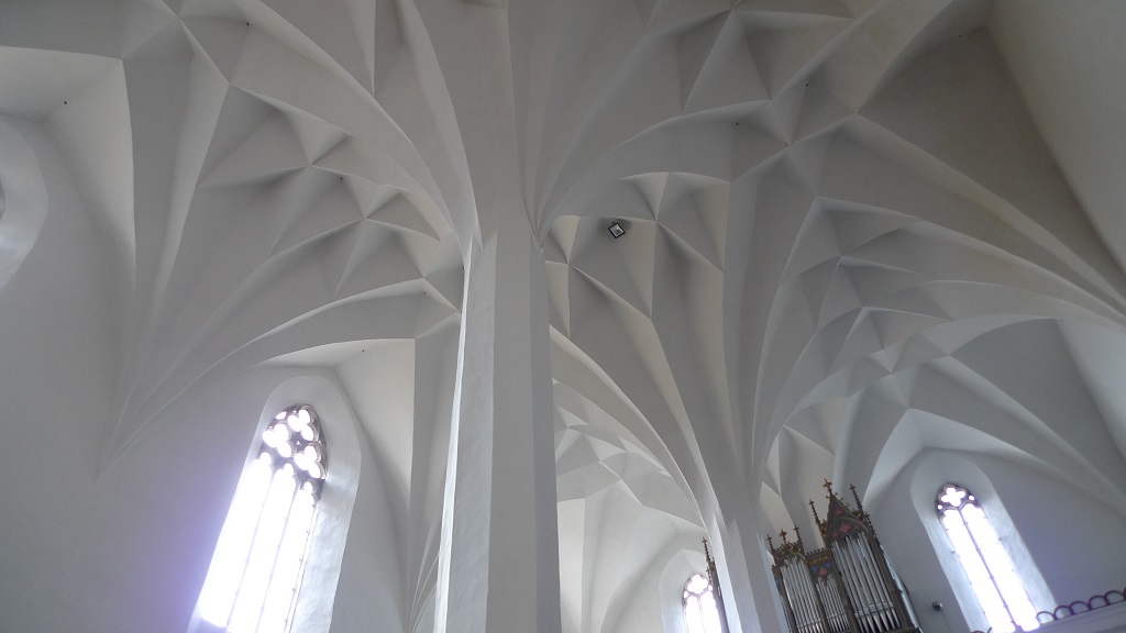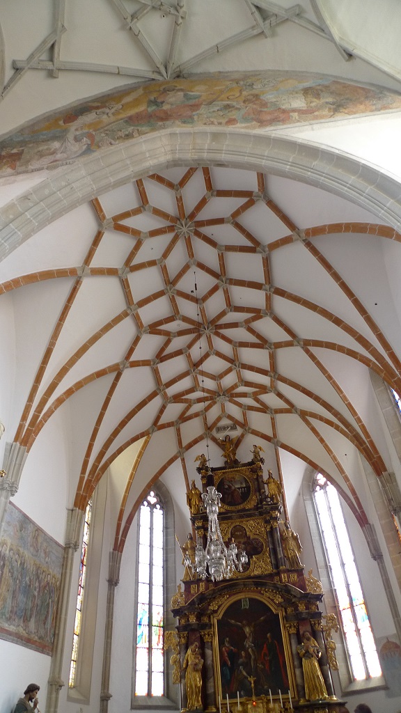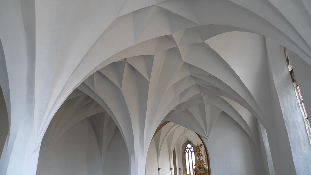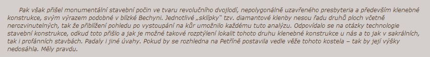 Pak však přišel monumentální stavební počin ve tvaru revolučního dvojlodí, nepolygonálně uzavřeného presbyteria a především klenebné konstrukce, svým výrazem podobné v blízké Bechyni. Jednotlivé „sklípky“ tzv. diamantové klenby nesou řadu druhů ploch včetně nerozvinutelných, tak že přiblížení pohledu po vystoupání na kůr umožnilo každému tuto analýzu. Odpovídalo se na otázky technologie stavební konstrukce, odkud toto přišlo a jak je možné takové rozptýlení lokalit tohoto druhu klenebné konstrukce u nás a to jak v sakrálních, tak i profánních stavbách. Padaly i jiné úvahy. Pokud by se rozhledna na Petříně postavila vedle věže tohoto kostela – tak by její výšky nedosáhla. Měly pravdu.