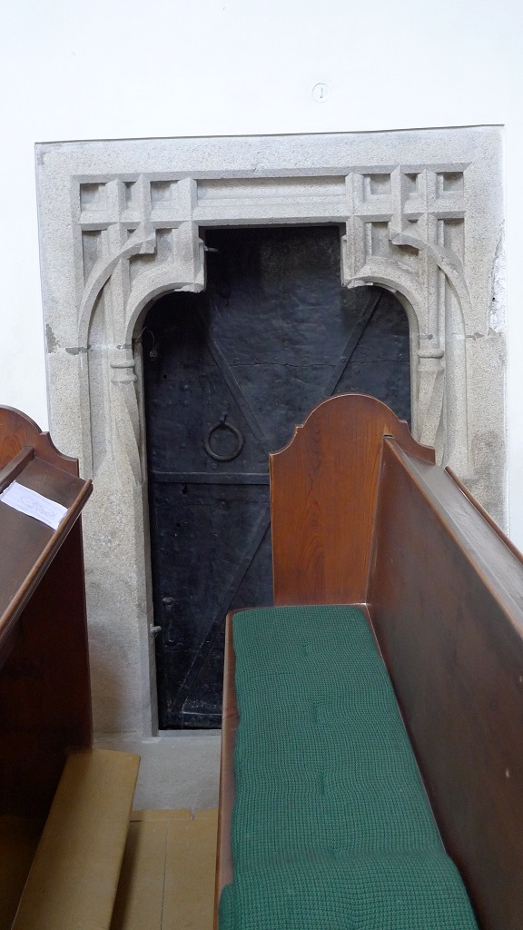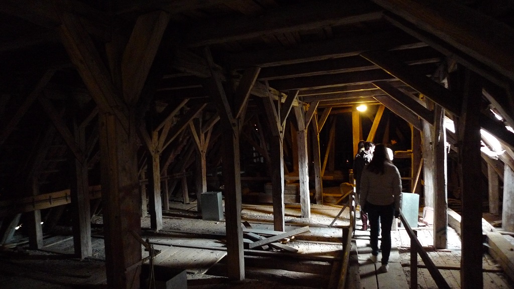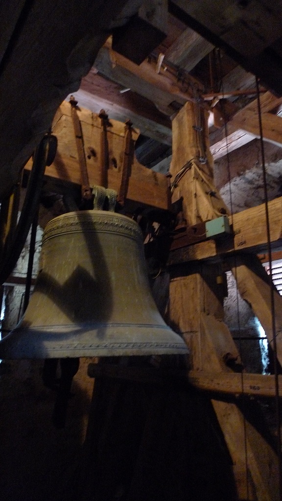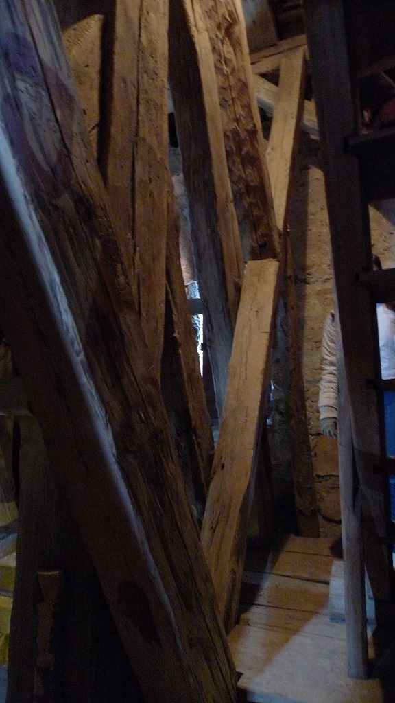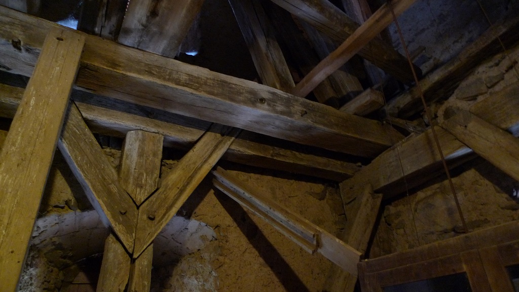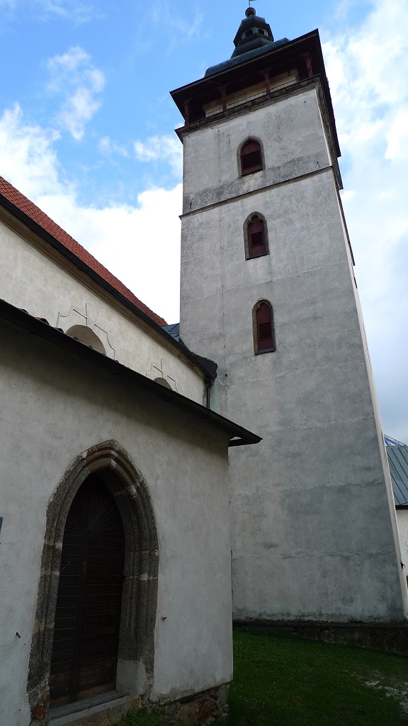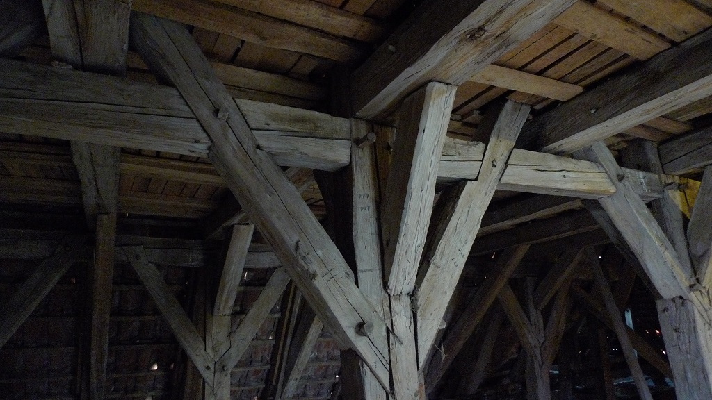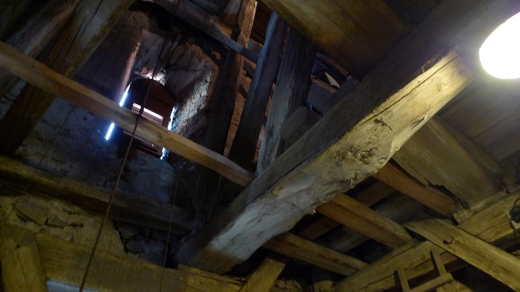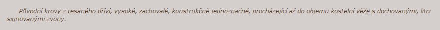 Původní krovy z tesaného dříví, vysoké, zachovalé, konstrukčně jednoznačné, procházející až do objemu kostelní věže s dochovanými, litci signovanými zvony.