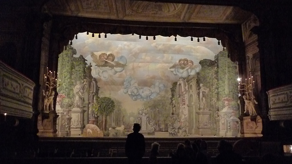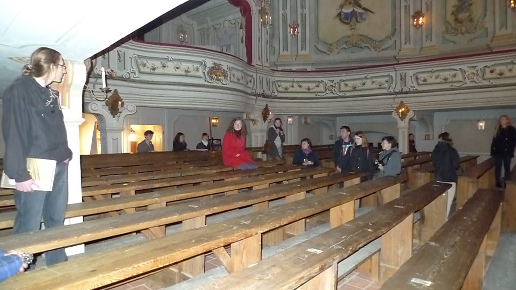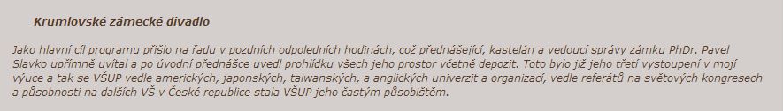 Důvodem cesty byl naprostý opak tohoto tvrzení. Podvědomí divadelní tradice v Českém Krumlově je stále spojováno především s diskutovanou poválečnou točnou hlediště v centru zámeckého parku před pavilonem Belarie. Toto neobvyklé zařízení umožňuje na jednu stranu nevšední divadelní zážitky a naopak svoji hmotou drsně přehodnocuje měřítka i tvarosloví svého okolí. Barokní divadlo, zázrakem dochovaný unikát včetně variantních scenografických celků, dochované mašinerie pod i nad podiem, s řadou rekvizit, akustických strojů i kostýmů je stále pro řadu návštěvníků překvapením. Již jednou bylo cílem podobné exkurze před několika lety, realizované v rámci discipliny PERSPEKTIVA pro studenty architektury. Stejně jako tehdy byla návštěva umožněna a především doprovázena výkladem ředitele zámku Český Krumlov, PhDr. Pavla Slavka, zakládajícího člena Nadace barokního divadla zámku Český Krumlov. Tento kontakt, který jsem získal laskavostí pana architekta Girsy, se již po několikáté svými fakty, analýzami a fundovaně pojatými hypotézami výrazně zapsal do výuky mnou přednášené discipliny.