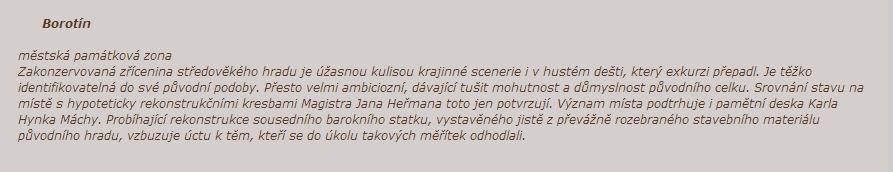 Zakonzervovaná zřícenina středověkého hradu je úžasnou kulisou krajinné scenerie i v hustém dešti, který exkurzi přepadl. Je těžko identifikovatelná do své původní podoby. Přesto velmi ambiciozní, dávající tušit mohutnost a důmyslnost původního celku. Srovnání stavu na místě s hypoteticky rekonstrukčními kresbami Magistra Jana Heřmana toto jen potvrzují. Význam místa podtrhuje i pamětní deska Karla Hynka Máchy.