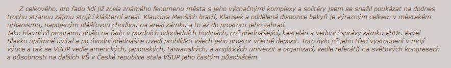Z celkového, pro řadu lidí již zcela známého fenomenu města s jeho význačnými komplexy a solitéry jsem se snažil poukázat na dodnes trochu stranou zájmu stojící klášterní areál. Klauzura Menších bratří, Klarisek a oddělená dispozice bekyň je výrazným celkem v městském urbanismu, napojeným plášťovou chodbou na areál zámku a to až do prostoru jeho zahrad.