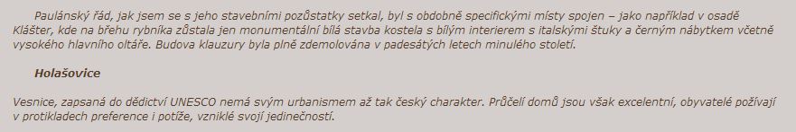 Vesnice, zapsaná do dědictví UNESCO nemá svým urbanismem až tak český charakter. Průčelí domů jsou však excelentní, obyvatelé požívají v protikladech preference i potíže, vzniklé svojí jedinečností.