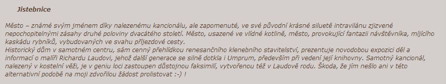 Historický dům v samotném centru, sám cenný přehlídkou renesančního klenebního stavitelství, prezentuje novodobou expozici děl a informací o malíři Richardu Laudovi, jehož další generace se silně dotkla i Umprum, především při vedení její knihovny. Samotný kancionál, nalezený v kostelní věži, je v geniu loci zastoupen důstojnou faksimilí, vytvořenou též v Laudově rodu. Škoda, že jím nešlo ani v této alternativní podobě na moji zdvořilou žádost prolistovat :-) !