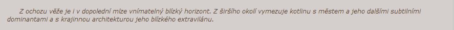 Z ochozu věže je i v dopolední mlze vnímatelný blízký horizont. Z širšího okolí vymezuje kotlinu s městem a jeho dalšími subtilními dominantami a s krajinnou architekturou jeho blízkého extravilánu.