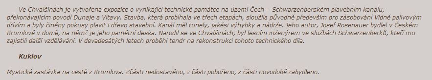 Ve Chvalšinách je vytvořena expozice o vynikající technické památce na území Čech – Schwarzenberském plavebním kanálu, překonávajícím povodí Dunaje a Vltavy. Stavba, která probíhala ve třech etapách, sloužila původně především pro zásobování Vídně palivovým dřívím a byly činěny pokusy plavit i dřevo stavební. Kanál měl tunely, jakési výhybky a nádrže. Jeho autor, Josef Rosenauer bydlel v Českém Krumlově v domě, na němž je jeho pamětní deska. Narodil se ve Chvalšinách, byl lesním inženýrem ve službách Schwarzenberků, kteří mu zajistili další vzdělávání. V devadesátých letech proběhl tendr na rekonstrukci tohoto technického díla.