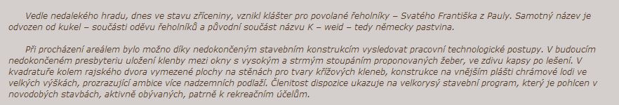 Vedle nedalekého hradu, dnes ve stavu zříceniny, vznikl klášter pro povolané řeholníky – Svatého Františka z Pauly. Samotný název je odvozen od kukel – součásti oděvu řeholníků a původní součást názvu K – weid – tedy německy pastvina.