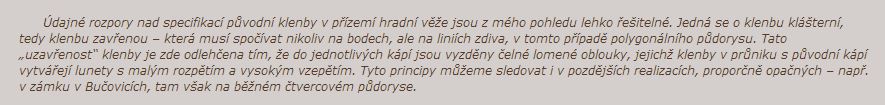 Údajné rozpory nad specifikací původní klenby v přízemí hradní věže jsou z mého pohledu lehko řešitelné. Jedná se o klenbu klášterní, tedy klenbu zavřenou – která musí spočívat nikoliv na bodech, ale na liniích zdiva, v tomto případě polygonálního půdorysu. Tato „uzavřenost“ klenby je zde odlehčena tím, že do jednotlivých kápí jsou vyzděny čelné lomené oblouky, jejichž klenby v průniku s původní kápí vytvářejí lunety s malým rozpětím a vysokým vzepětím. Tyto principy můžeme sledovat i v pozdějších realizacích, proporčně opačných – např. v zámku v Bučovicích, tam však na běžném čtvercovém půdoryse.
