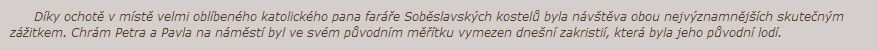 Díky ochotě v místě velmi oblíbeného katolického pana faráře Soběslavských kostelů byla návštěva obou nejvýznamnějších skutečným zážitkem. Chrám Petra a Pavla na náměstí byl ve svém původním měřítku vymezen dnešní zakristií, která byla jeho původní lodí.