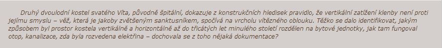 Druhý dvoulodní kostel svatého Víta, původně špitální, dokazuje z konstrukčních hledisek pravidlo, že vertikální zatížení klenby není proti jejímu smyslu – věž, která je jakoby zvětšeným sanktusníkem, spočívá na vrcholu vítězného oblouku. Těžko se dalo identifikovat, jakým způsobem byl prostor kostela vertikálně a horizontálně až do třicátých let minulého století rozdělen na bytové jednotky, jak tam fungoval otop, kanalizace, zda byla rozvedena elektřina – dochovala se z toho nějaká dokumentace?
