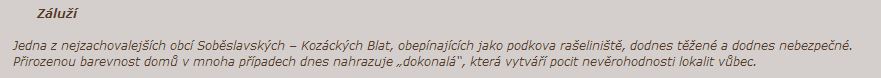 Jedna z nejzachovalejších obcí Soběslavských – Kozáckých Blat, obepínajících jako podkova rašeliniště, dodnes těžené a dodnes nebezpečné. Přirozenou barevnost domů v mnoha případech dnes nahrazuje „dokonalá“, která vytváří pocit nevěrohodnosti lokalit vůbec.