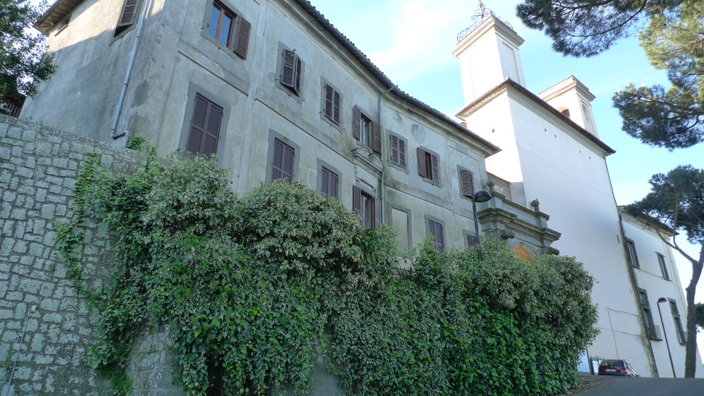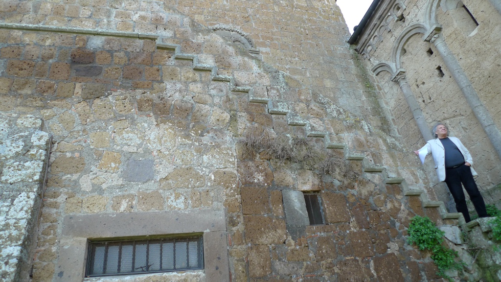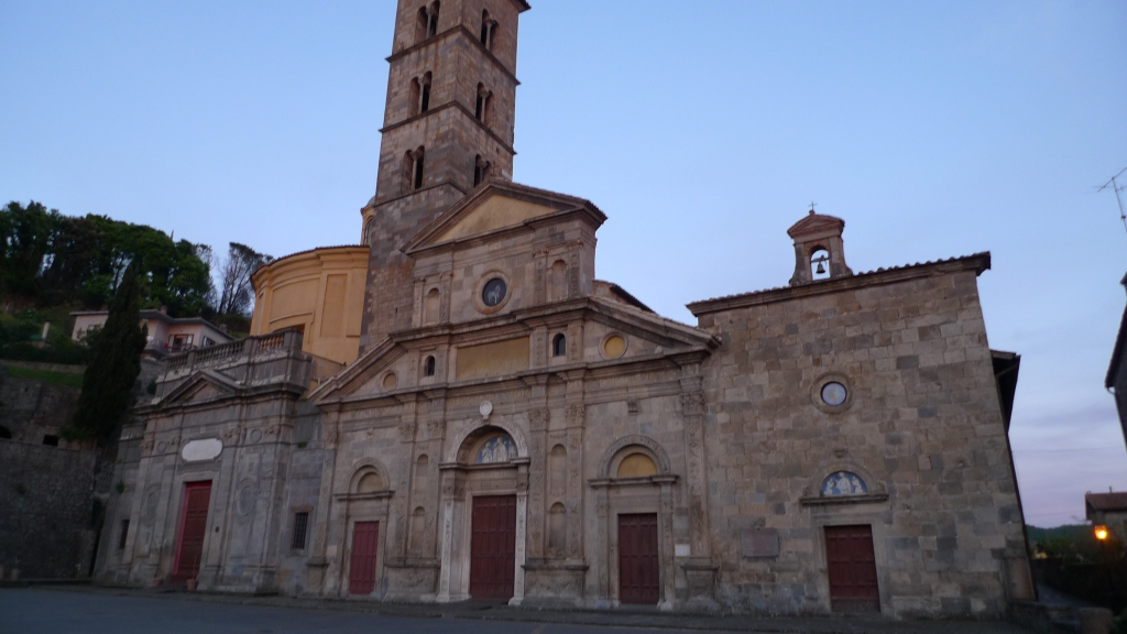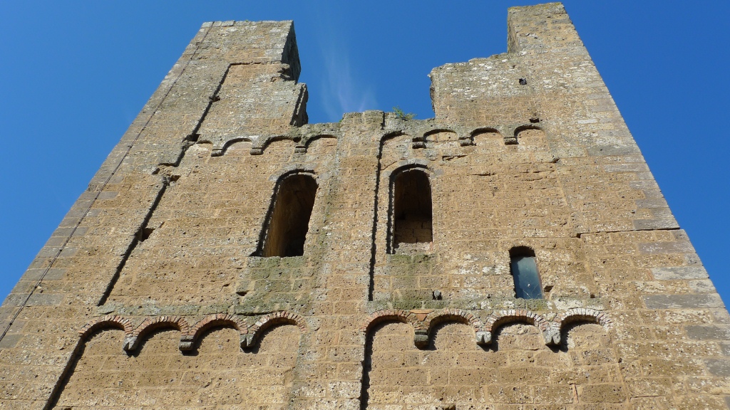 kostel San Pietro – na vrcholu kopce za městem, hrazený, z tufů a mramoru, románský – 12. stol. – campanila mimo areál – součást opevnění - exteriér