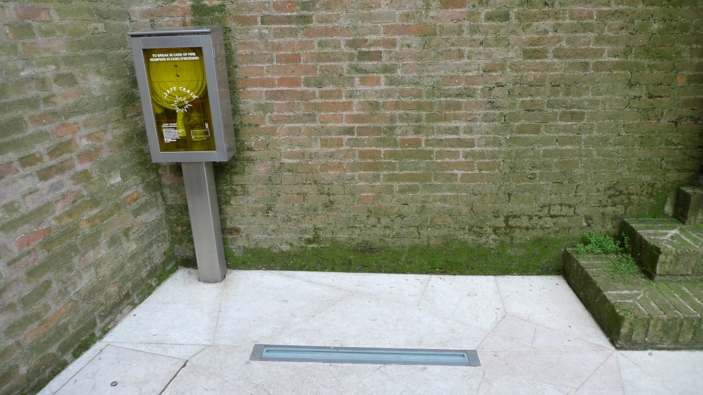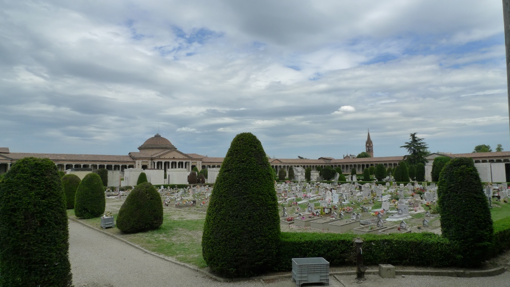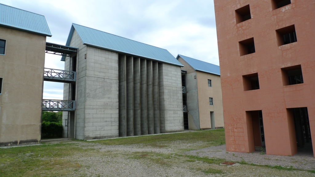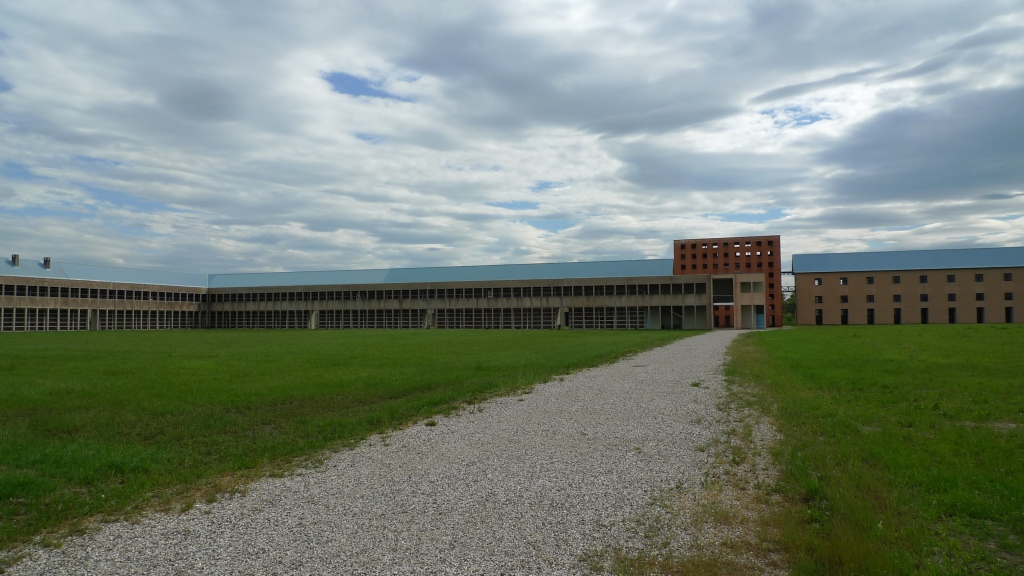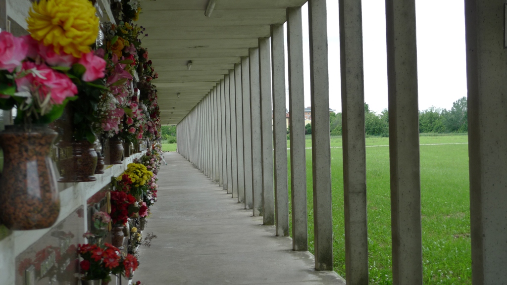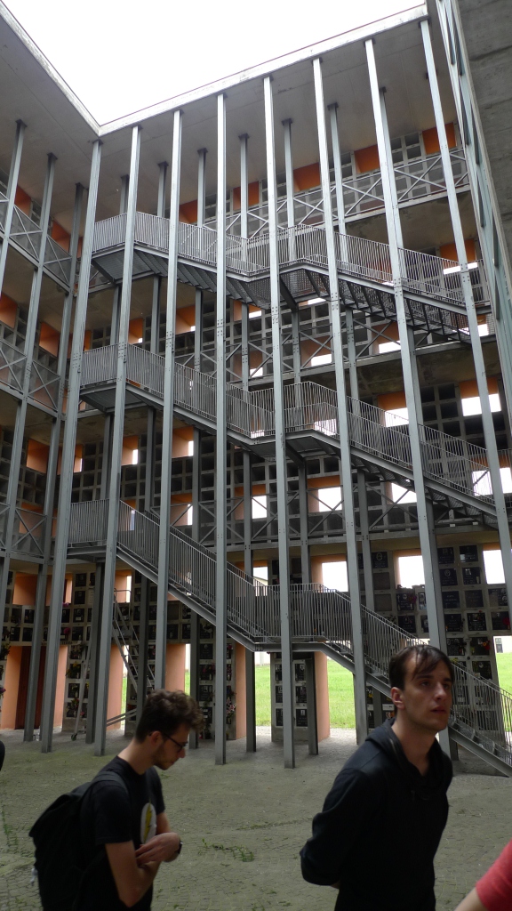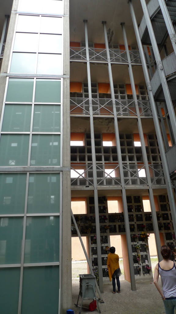 Hřbitov San Cataldo, stará část - nová část nekropole – architekt Aldo Rossi – koridory columbarií a středová hmota columbaria s podlažími, pavlačemi, schodišti a výtahem v ocelové konstrukci uvnitř obezděného pláště