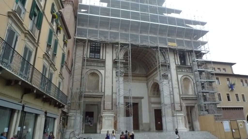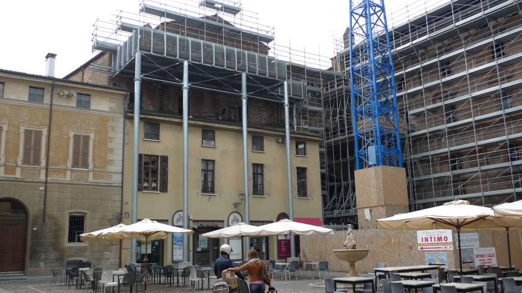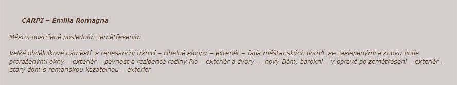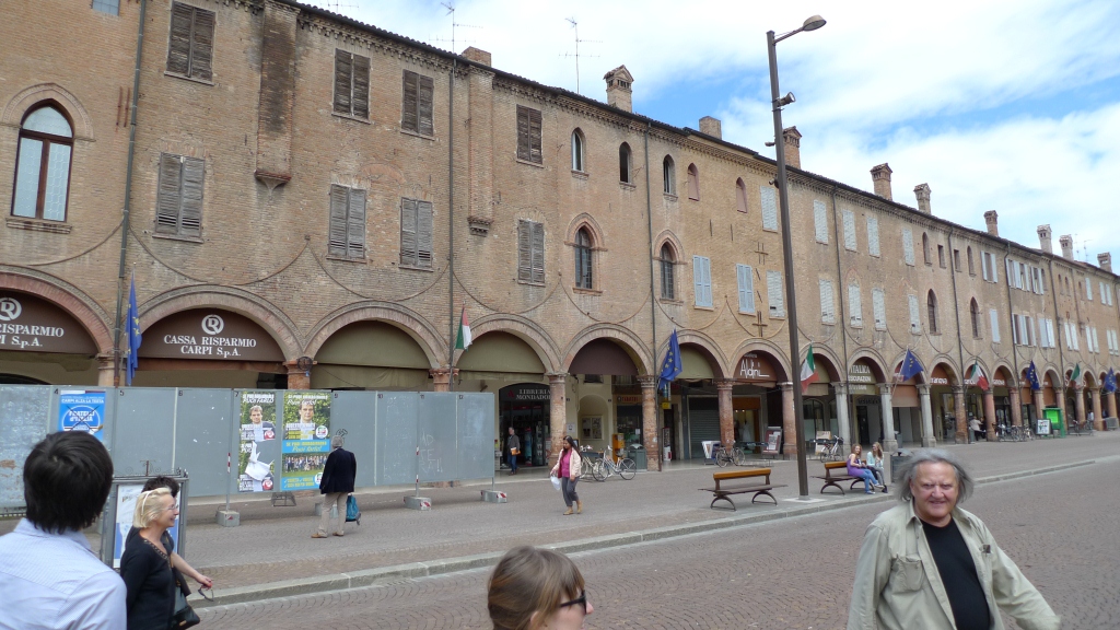 Velké obdélníkové náměstí s renesanční tržnicí – cihelné sloupy – exteriér – řada měšťanských domů se zaslepenými a znovu jinde proraženými okny – exteriér – pevnost a rezidence rodiny Pio – exteriér a dvory – nový Dóm, barokní – v opravě po zemětřesení – exteriér – starý dóm s románskou kazatelnou – exteriér