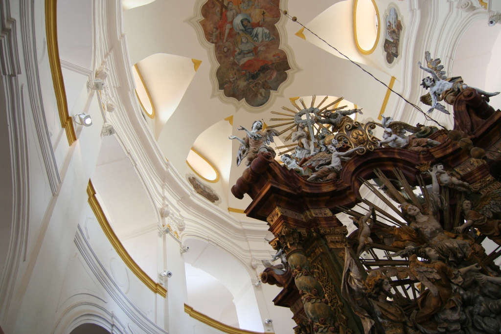 románský dóm, trojlodí s přistavěnou čtvrtou lodí navazující na dostavbu campanilly, patrová křtitelnice z první poloviny 16. století, původní chorové lavice, dolní starší kostel se sochami Pisanovými, krypta biskupů a krypta chudých – včetně instalace chrámového inventáře - interier