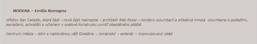 Studijní výjezd byl dlouho připravován a pro komentáře byl stažen materiál z řady knižních, obrazových, mých písemných záznamů z cest do Itálie a internetových informací, velmi cenným materiálem byla studie ORT UND PLATZ, zpracovaná pedagogy a studenty Vídeňské UMPRUM v druhé polovině osmdesátých let.