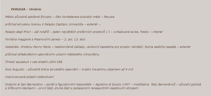 Absolvovaný program exkurze Katedry architektury Vysoké školy uměleckoprůmyslové v Praze 6. až 11. květen 2014
