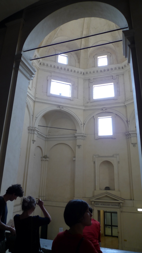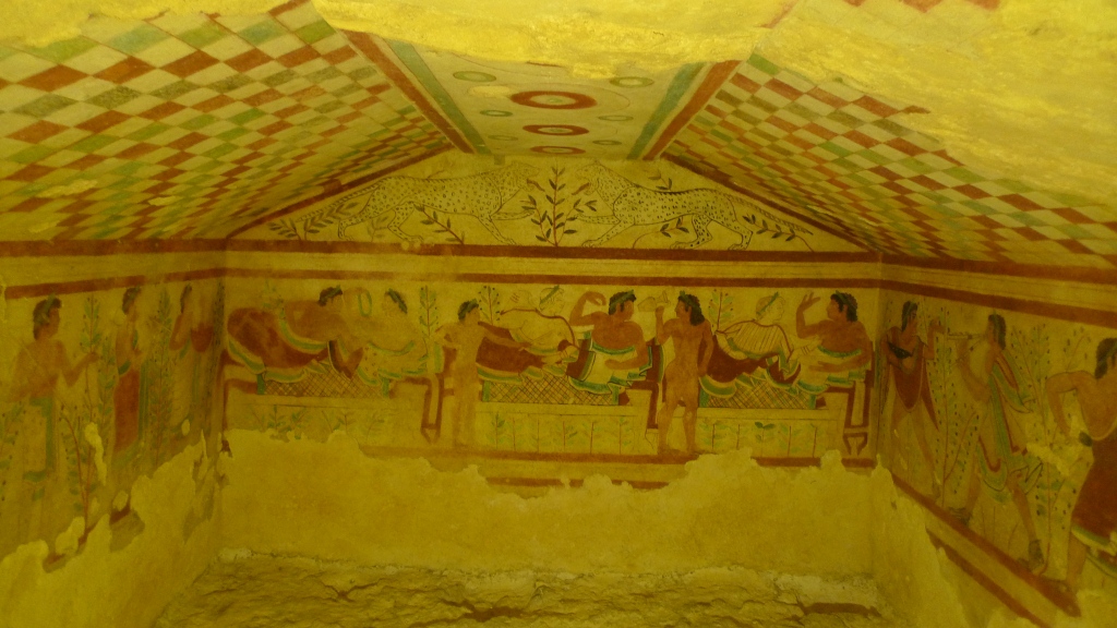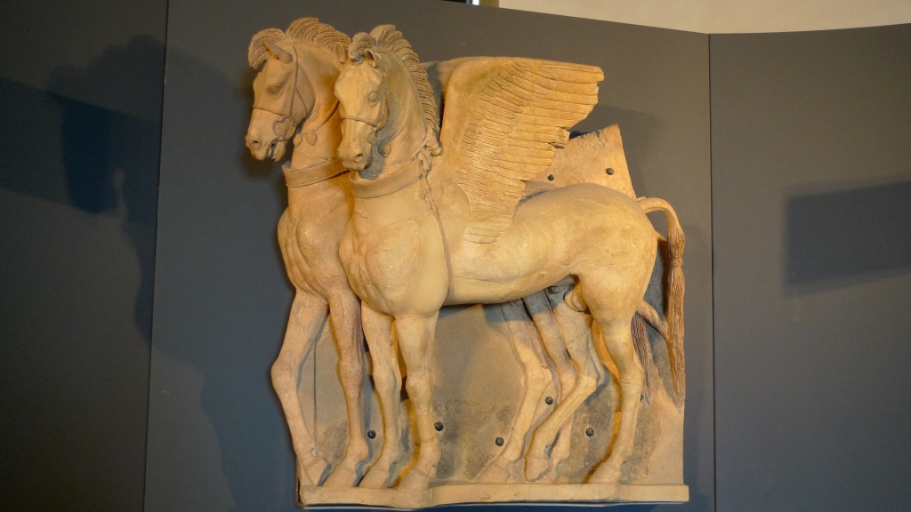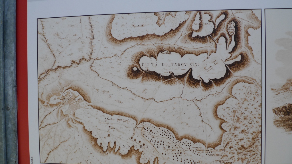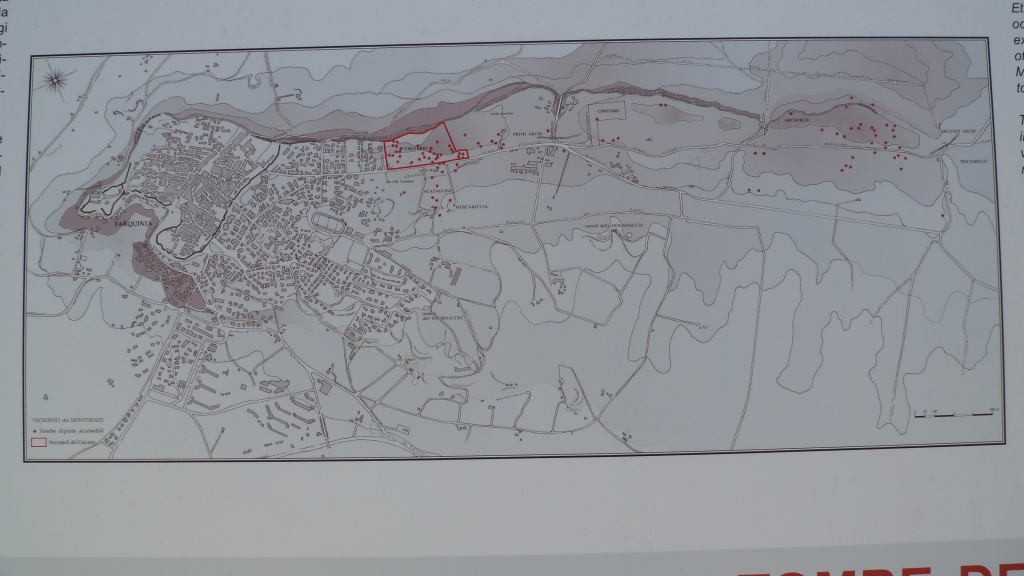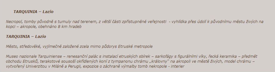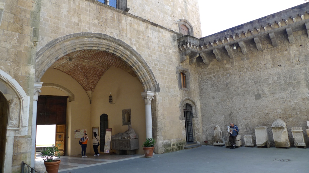 Museo nazionale Tarquiniense – renesanční palác s instalací etruských sbírek – sarkofágy s figurálními víky, řecká keramika – předmět obchodu Etrusků, terakotové sousoší okřídlených koní z tympanonu chrámu „královny“ na akropoli ve městě živých, model chrámu – vytvořený Univerzitou v Miláně a Perugii, expozice o záchraně výmalby tomb nekropole - interier