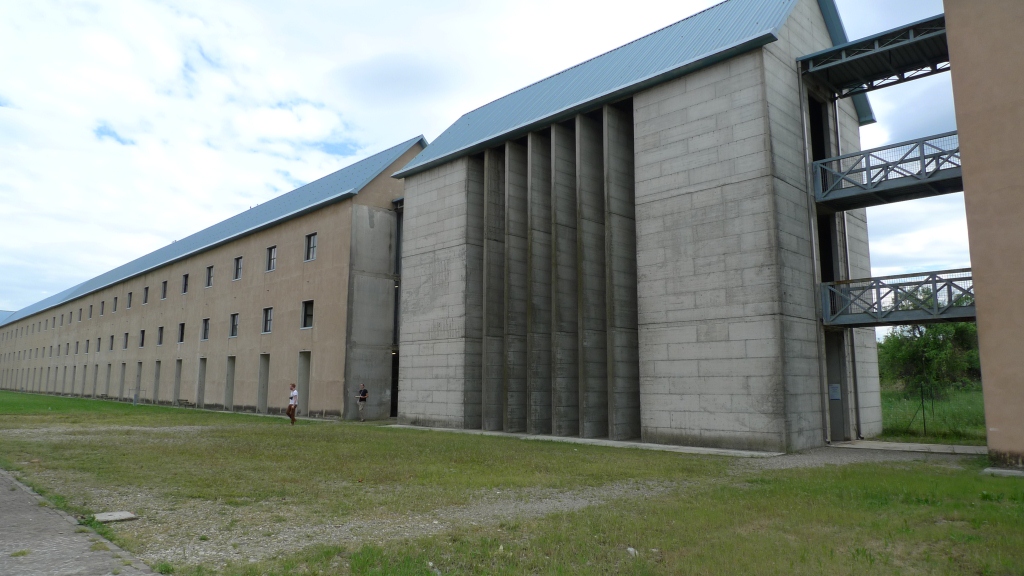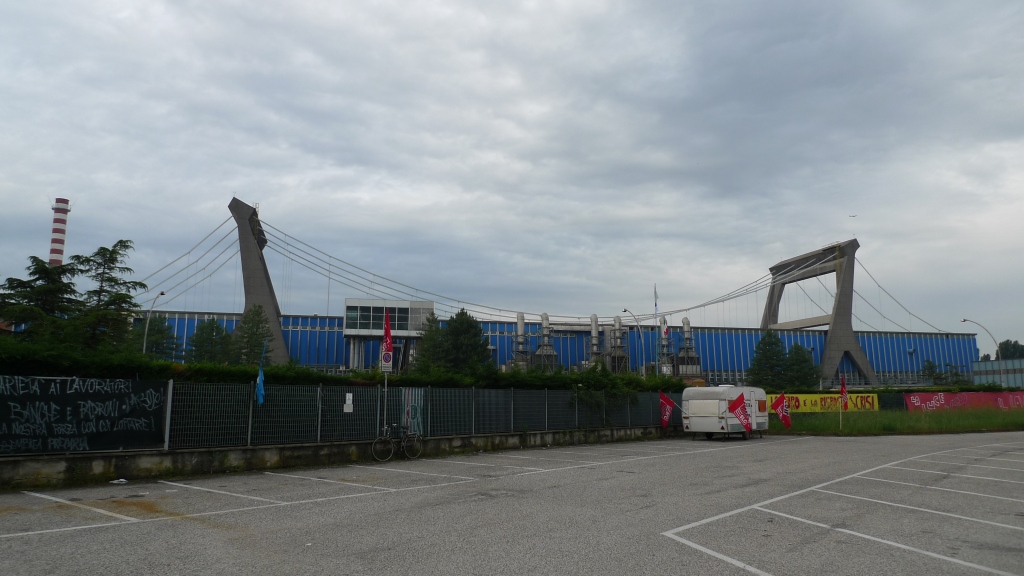carteria – papírna BORGO - Luigi Nervi 1961 – velkorozponová zavěšená konstrukce mezi dvěma železobetonovými portály – exteriér