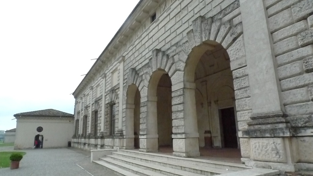 Palazzo del Té – letní sídlo rodu Gonzágů – jednopodlažní manýristická dispozice s dvorem, salla terrenou, vodním příkopem a zahradou ukončenou segmentovým loubím včetně jízdárny - interiery původní podlahy, štuky, reliéfy, kazetové stropy – sál gigantů – čtvercová místnost s kupolovou zavřenou klenbou, stěny i klenba bez hranice vymalována Giuliem Romanem, motiv gigantů – měřítkem nadlidské postavy drceny padající architekturou – prostorová iluze, popírající architekturu prostoru - interier