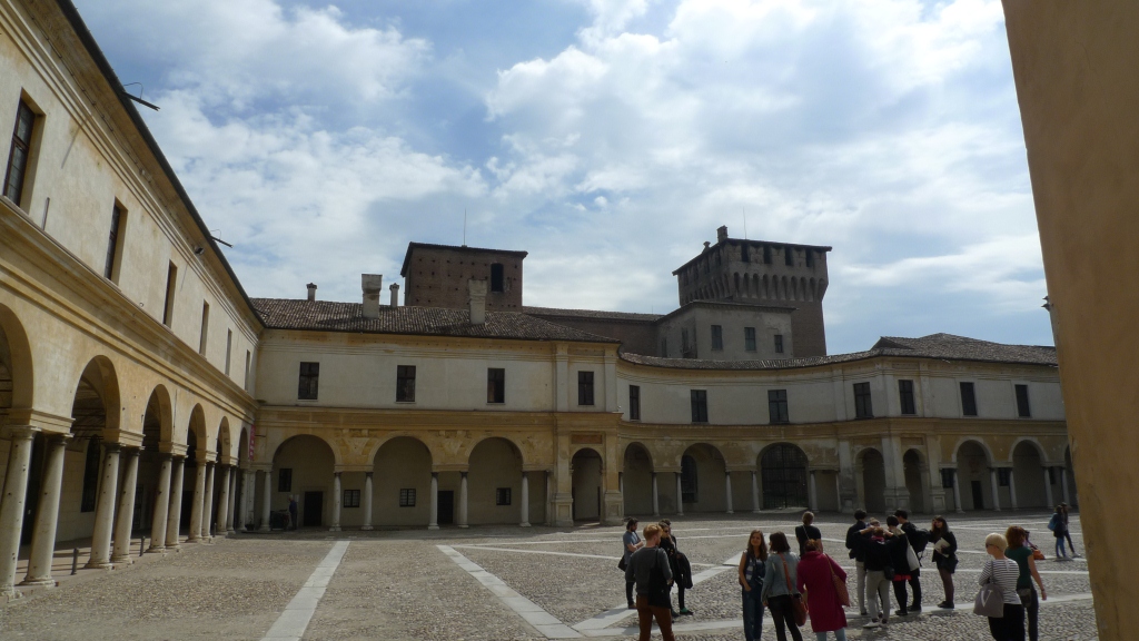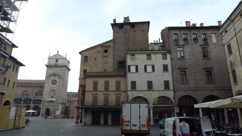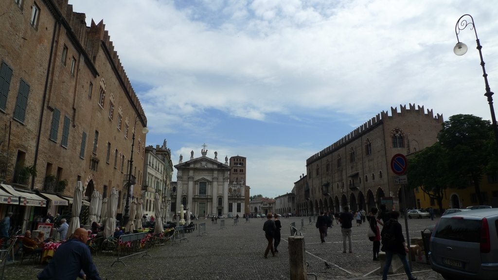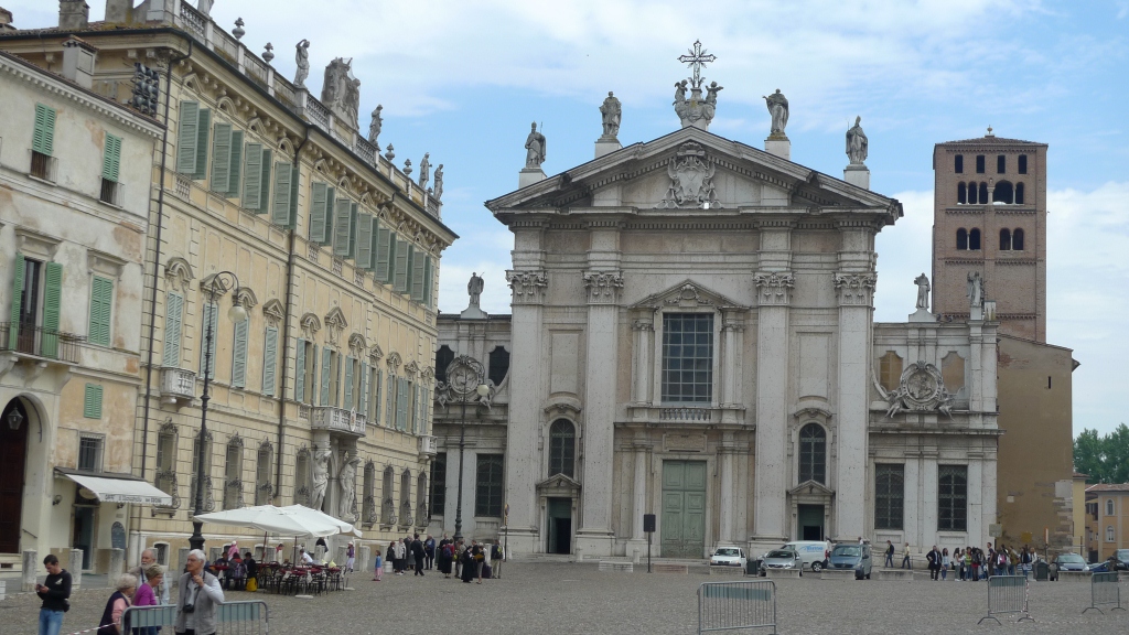 Piazza Sordello – Palazzo Guervieri s 55 m vysokou věží, sousedící Palazzo Bonacolsi - Catiglioni – oba 13. Stol. oba s cimbuřím, v téže frontě biskupský palác 18. Stol. s giganty nad portálem – exteriér, na protější straně Palazzo Ducale, původní část středověká, doplněná pozdějšími přístavbami a kostelem Santa Barbara v duchu paladinské architektury, pevnost San Giorgio, chránící palác ze vně obvodu města – exteriér, zahrada, dvory - katedrála sv. Petra – původně románská, výrazně přestavěná Giuliem Románem na pětilodní baziliku – zvonice románská, s nepravidelnými rytmy sdružených oken – interier