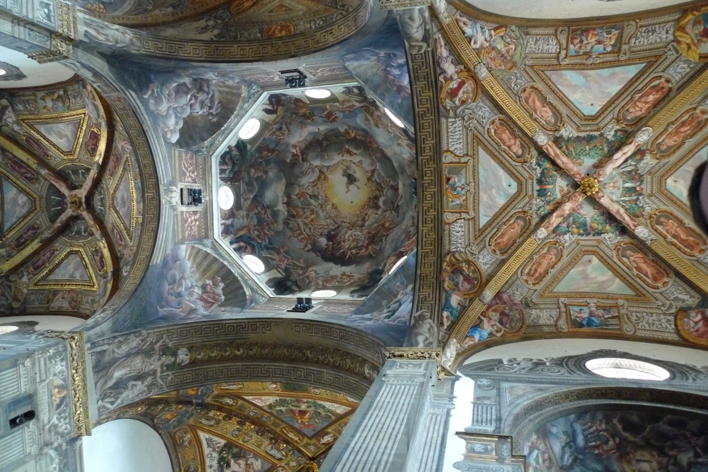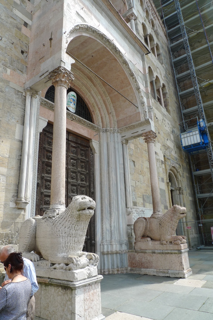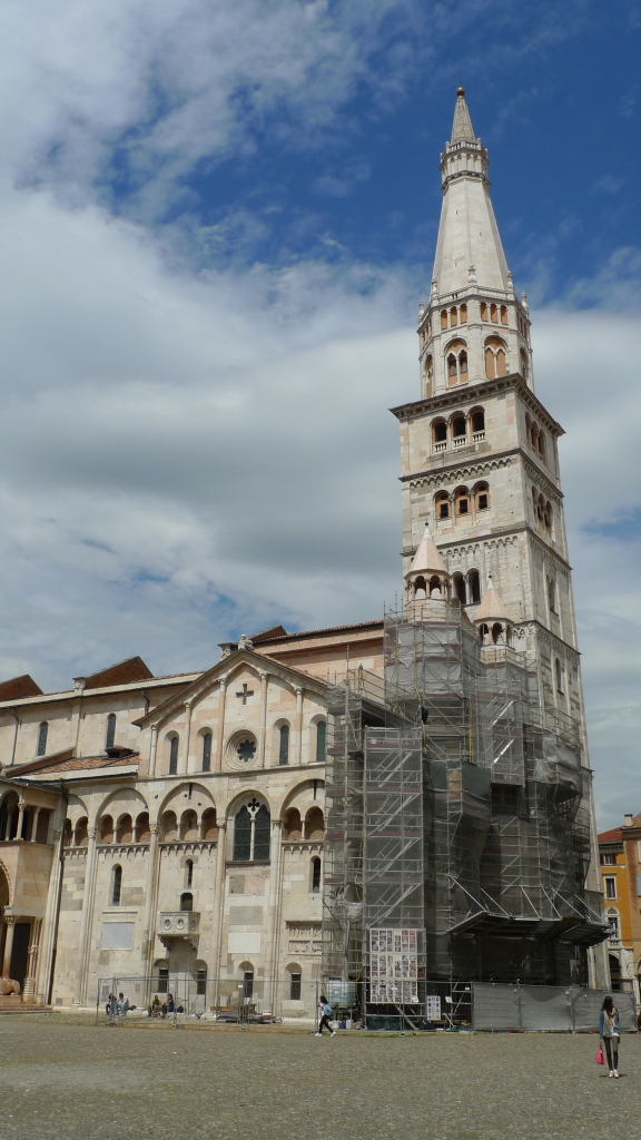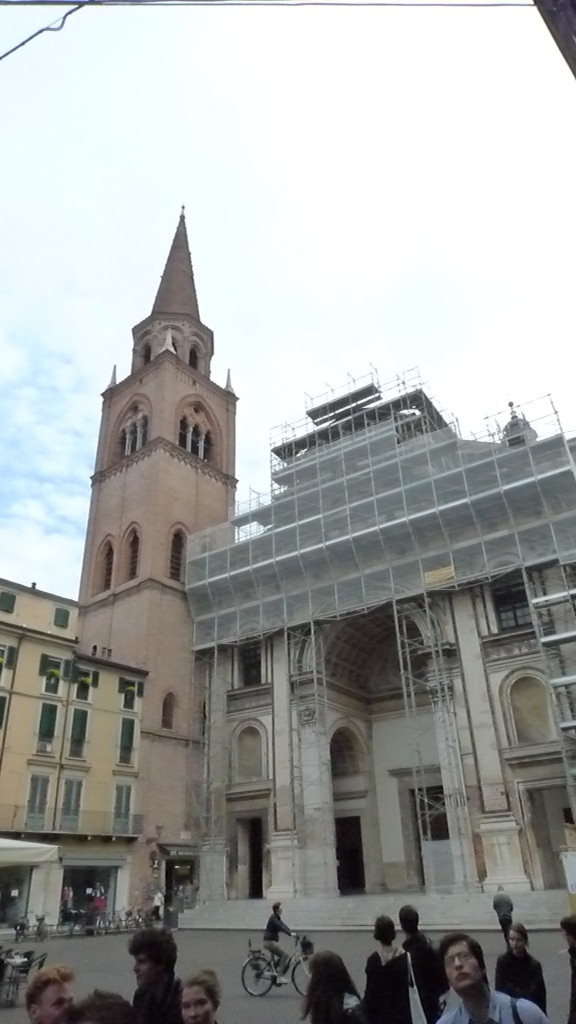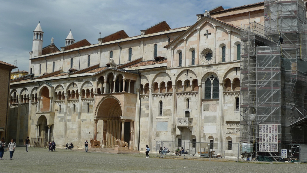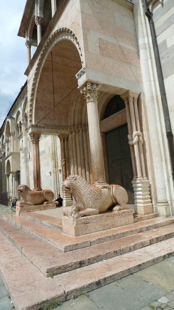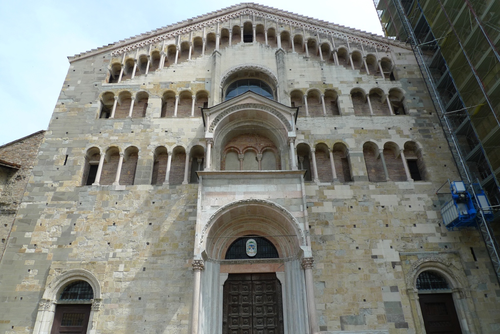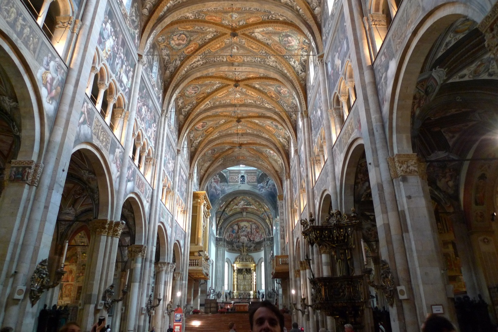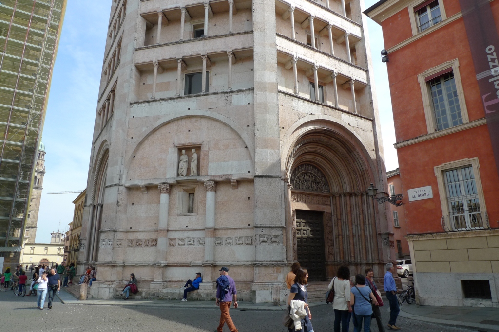 Dómské náměstí – dóm, původně románský, dostavovaný v gotickém a pozdějším období, kdy je zaklenut nízkými křížovými klenbami a vybudována kupole s malbou Corregiovou – Nanebevzetí panny Marie – 1584, dále v transeptu snímání z kříže od Antelamiho – pol. 12. stol. – u vchodu v západním vstupním průčelí dvě románské plastiky stylizovaných lvů, nesoucích na svém těle sloupy portiku nad hlavním portálem - interier