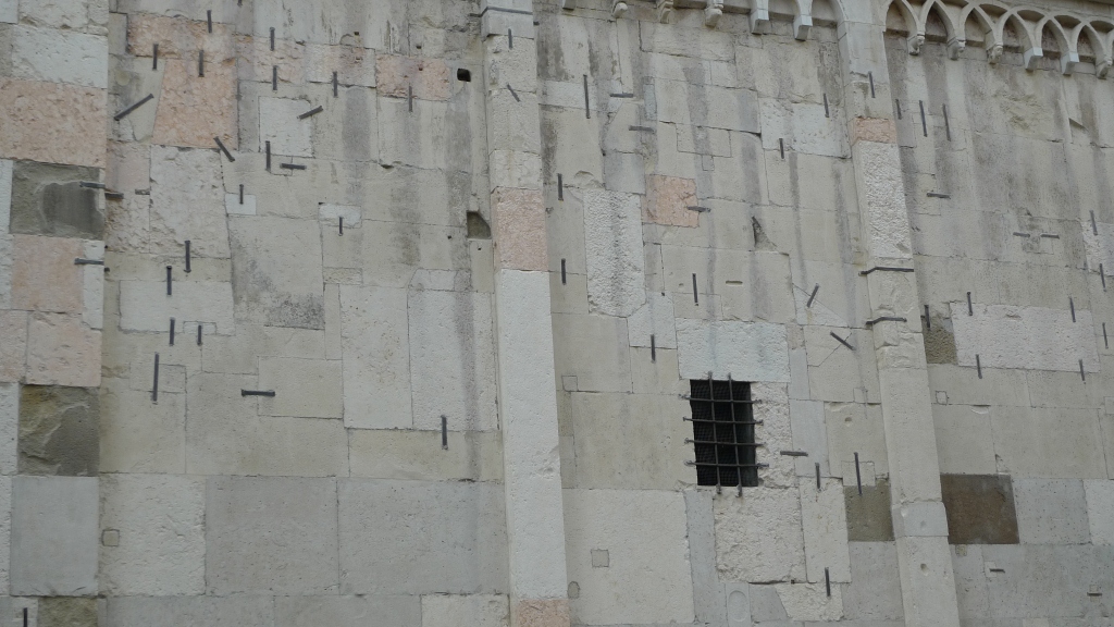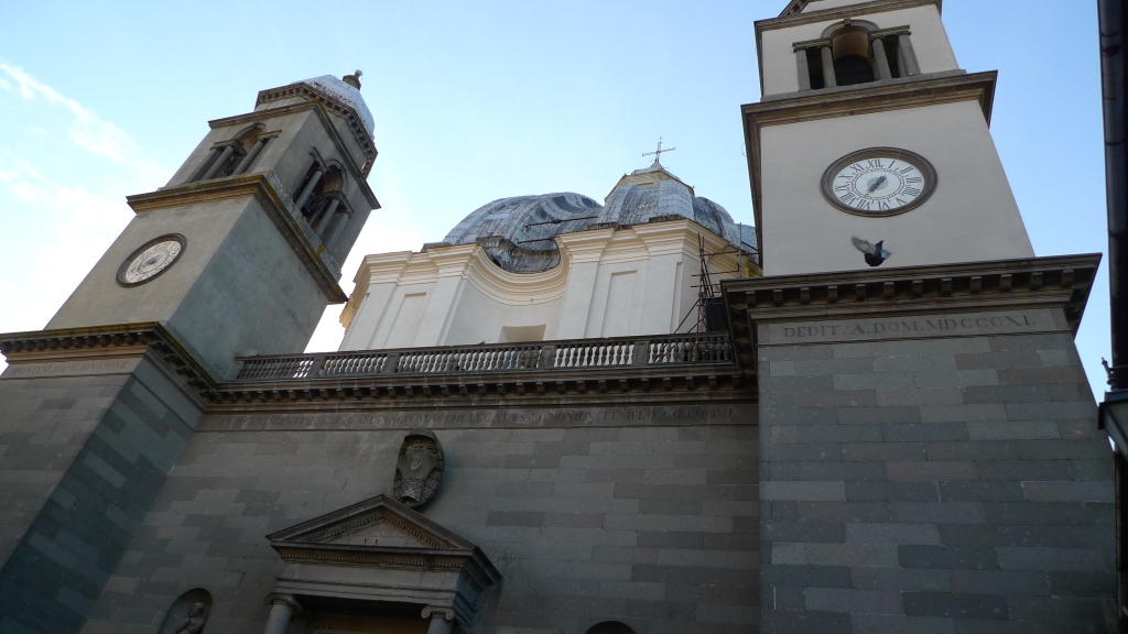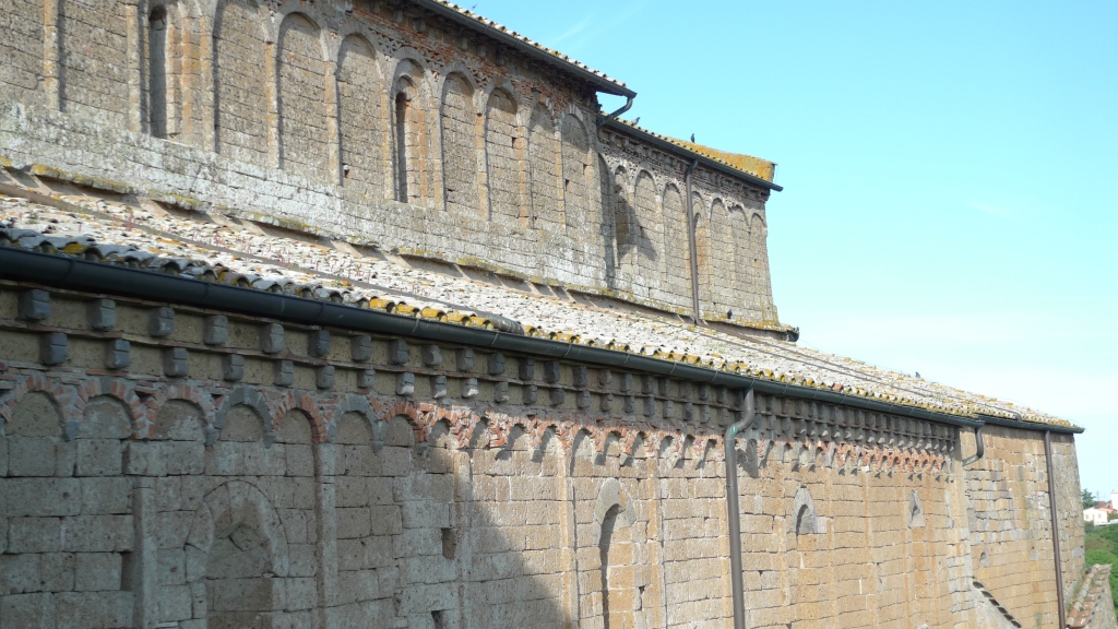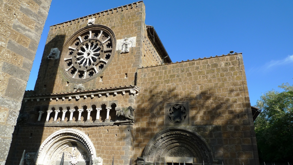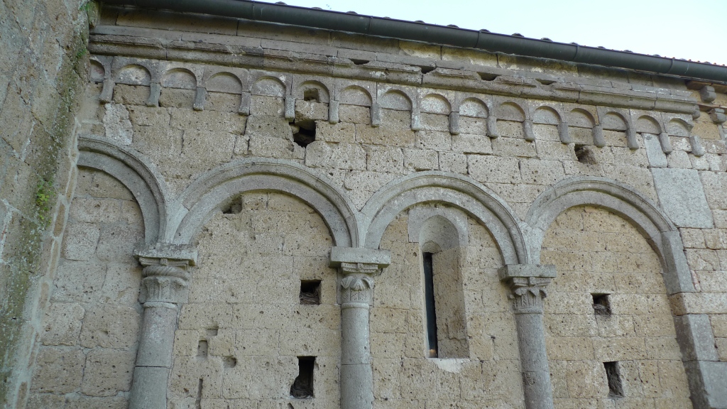 kostel Santa Maria Maggiore – v údolí za městem, z tufů a mramoru, roseta s reliéfy, kampanila těsně před západním průčelím – románský 1050 – exteriér