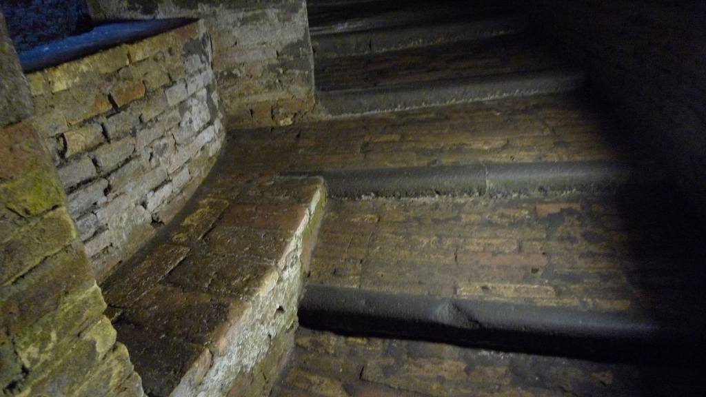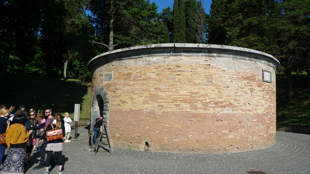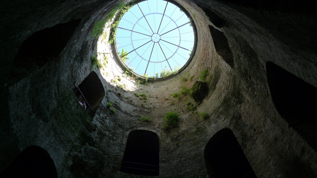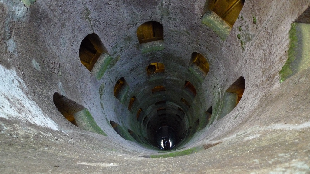 Pozzo di San Patrizio – studna svatého Patrika, 60 metrů vyhloubená pod zem, možné využití původní etruské stavby, dvojí schodiště pro pohyb mul směrem dolů, tam náběr vody a druhým schodištěm směrem vzhůru – uzpůsobení stupňů, eliptický půdorys, nezastřešené vřeteno – architekt San Gallo st. – interier