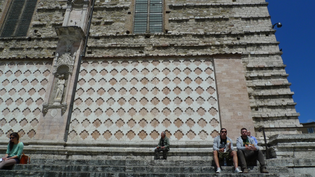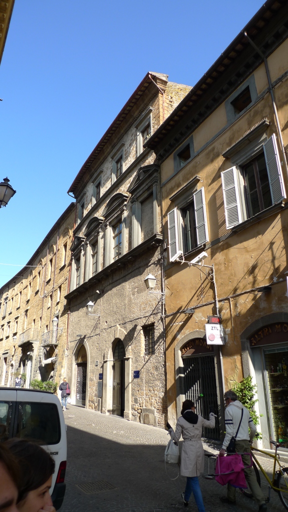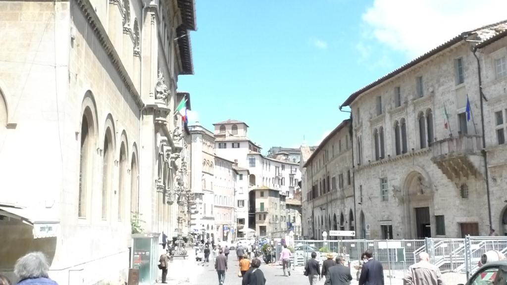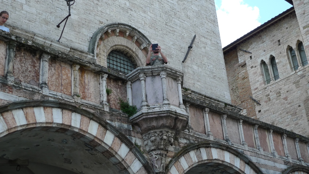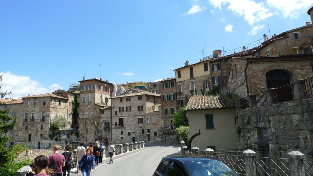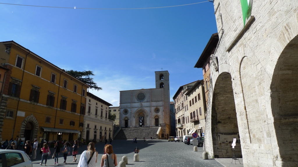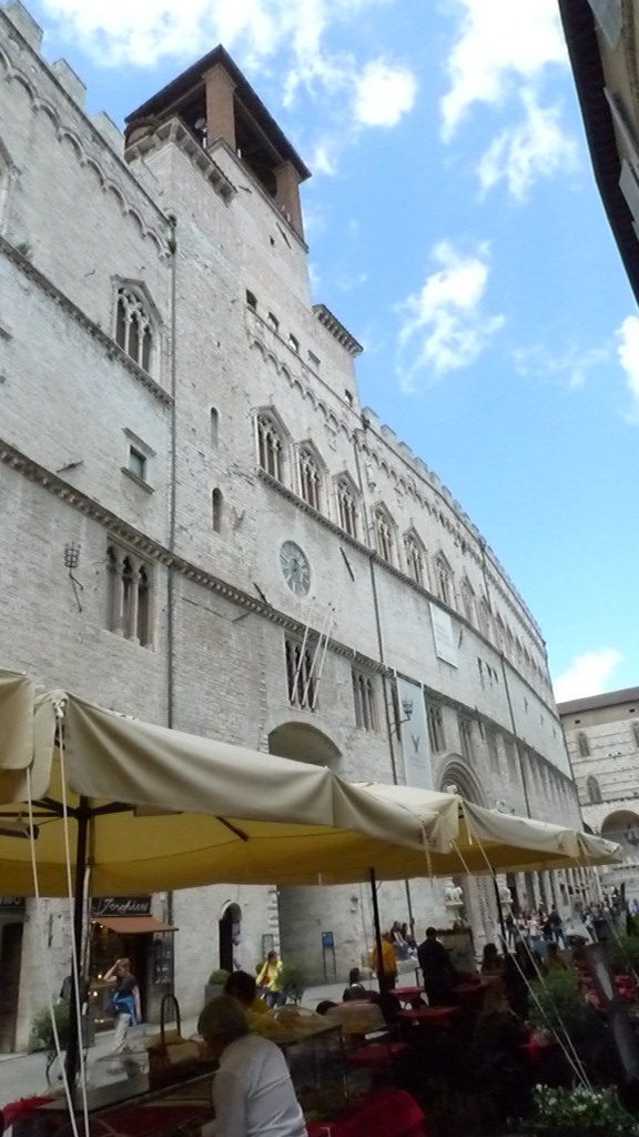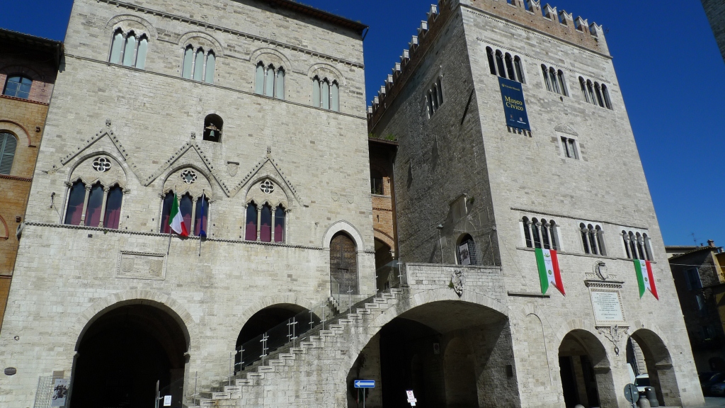 paláce –proti dómu Palazzo degli Priori – Podestá s orlem, symbolem města, dále dvojice paláců, sjednocených jedním přístupovým monumentálním schodištěm – Palazzo del Popolo a Palazzo del Capitano – 13. Stol., terasa za pomníkem Garibaldiho s výhledem do Umbrijské krajiny - exterier