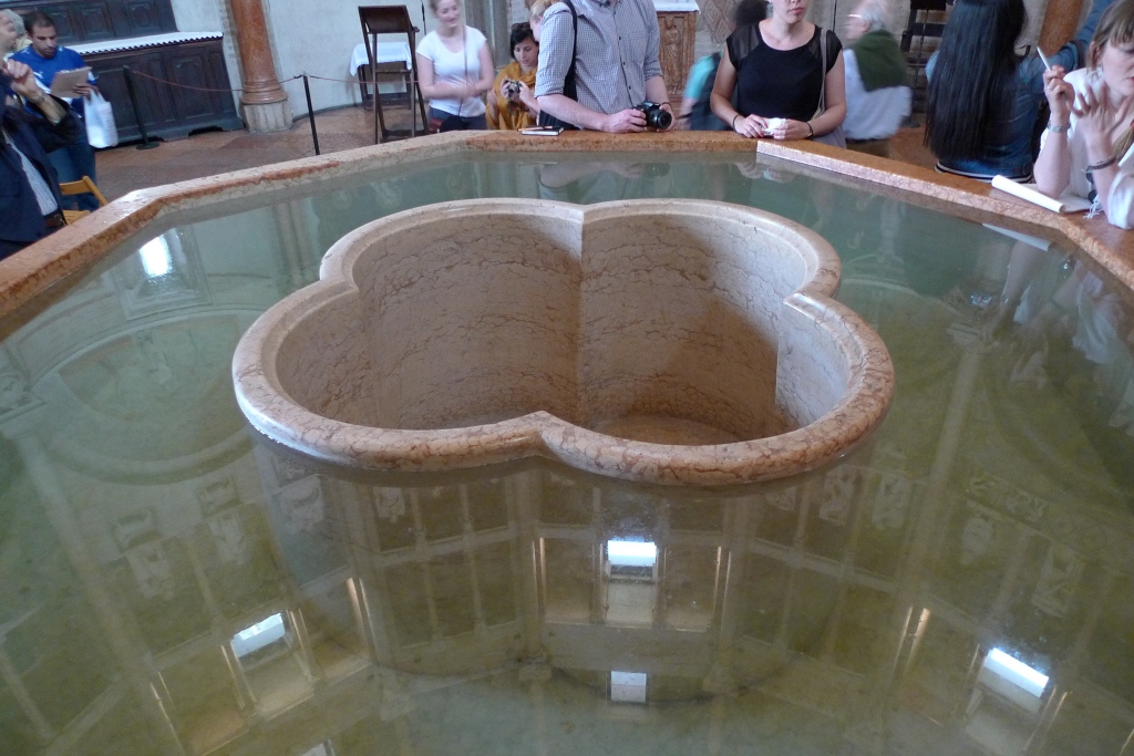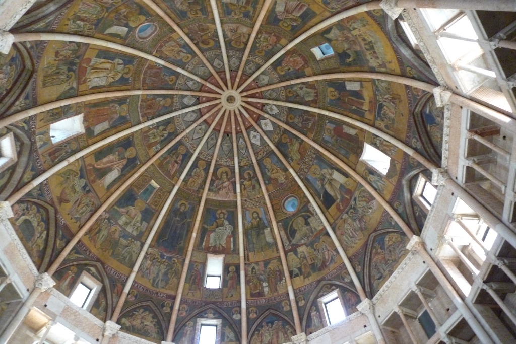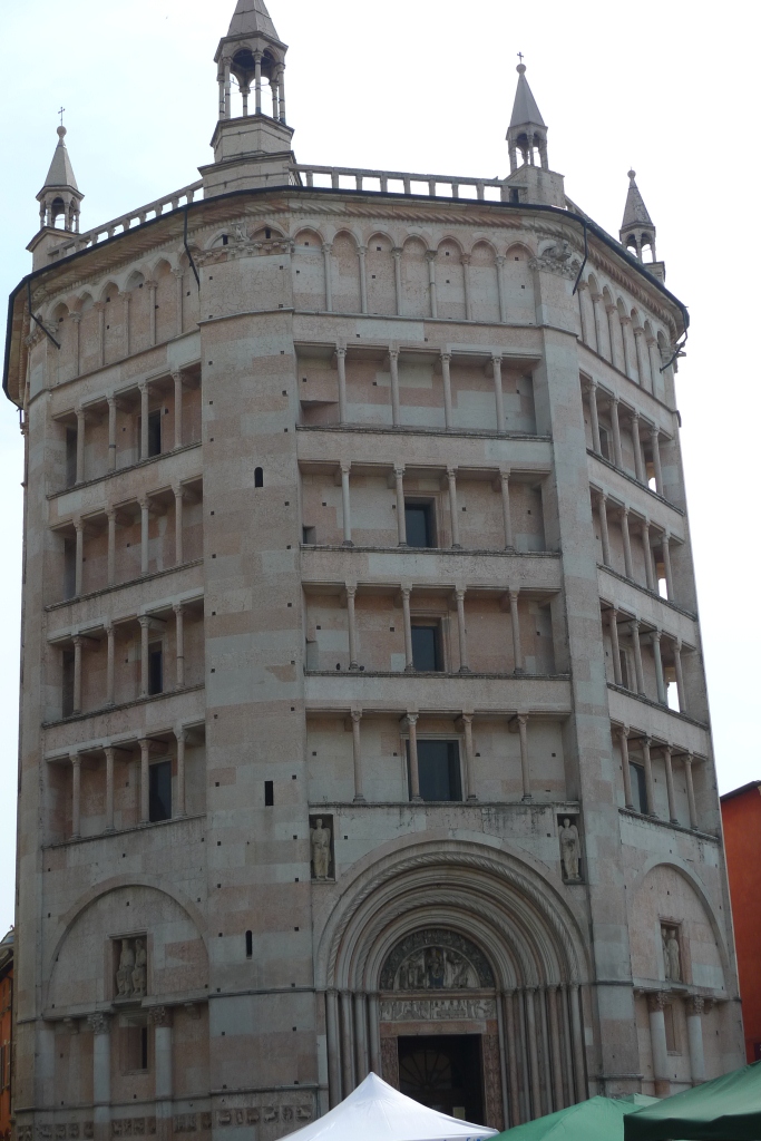 Baptisterium – románské, s arkádami na obvodu, vnější plášť osmiboký, vnitřní plášť šestnáctiboký, ve středu křtící mramorová vana ve tvaru quadrilobu s vymezením ohrazeného středu bez vody – původní projekt – vnější a vnitřní plášť Antelami, zastřešené polygonální kupolí v gotickém obdob - interierí