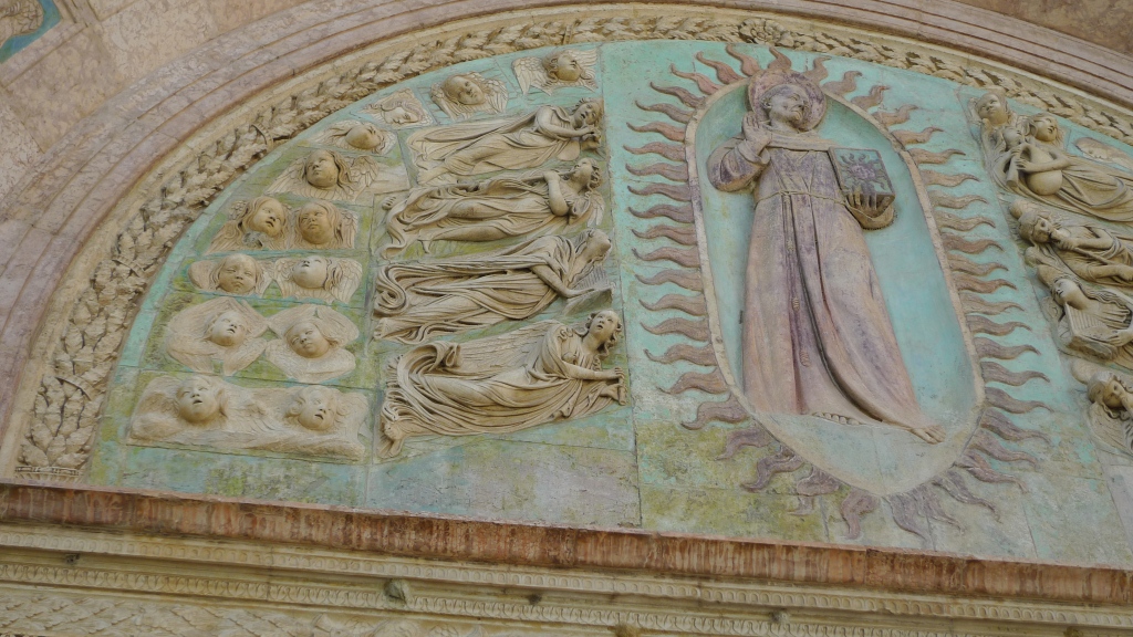 Oratorio di San Bernardino – portál s figurativními bassreliefy – Agostino di Duccio 1457 – modlitebna řádu Bernardinců – původní gotická s křížovými klenbami – první část, druhá část s pozlaceným renesančním kazetovým stropem