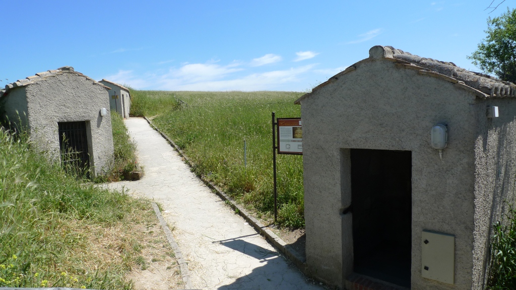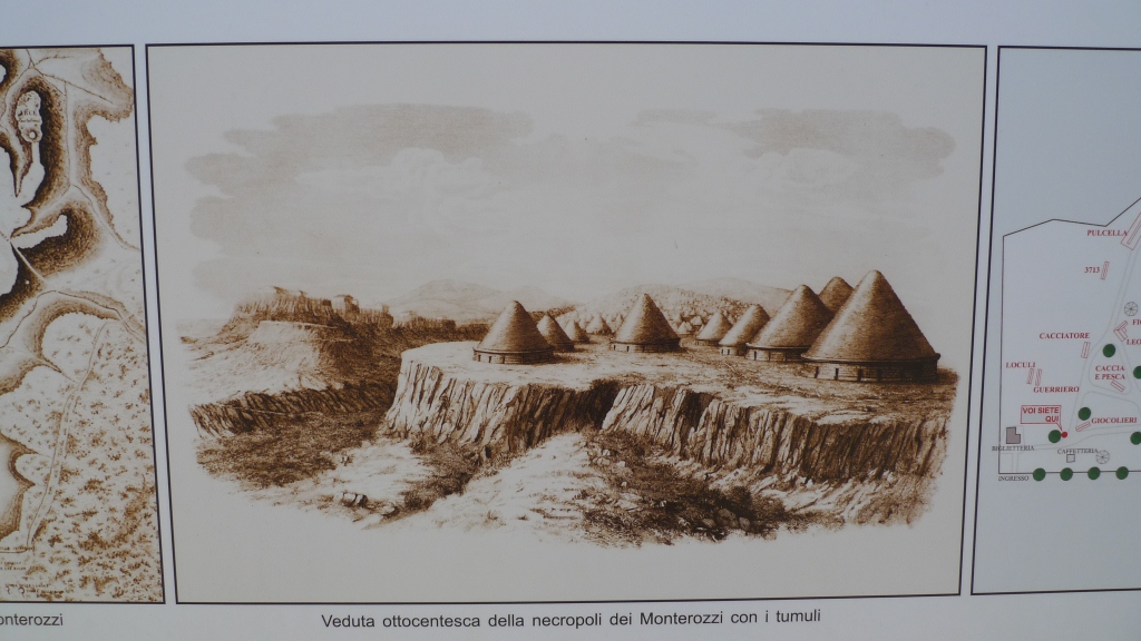 Necropol, tomby původně s tumuly nad terenem, z větší části zpřístupněné veřejnosti - vyhlídka přes údolí k původnímu městu živých na kopci – akropole, obehnáno 8 km hradeb