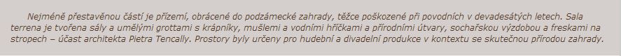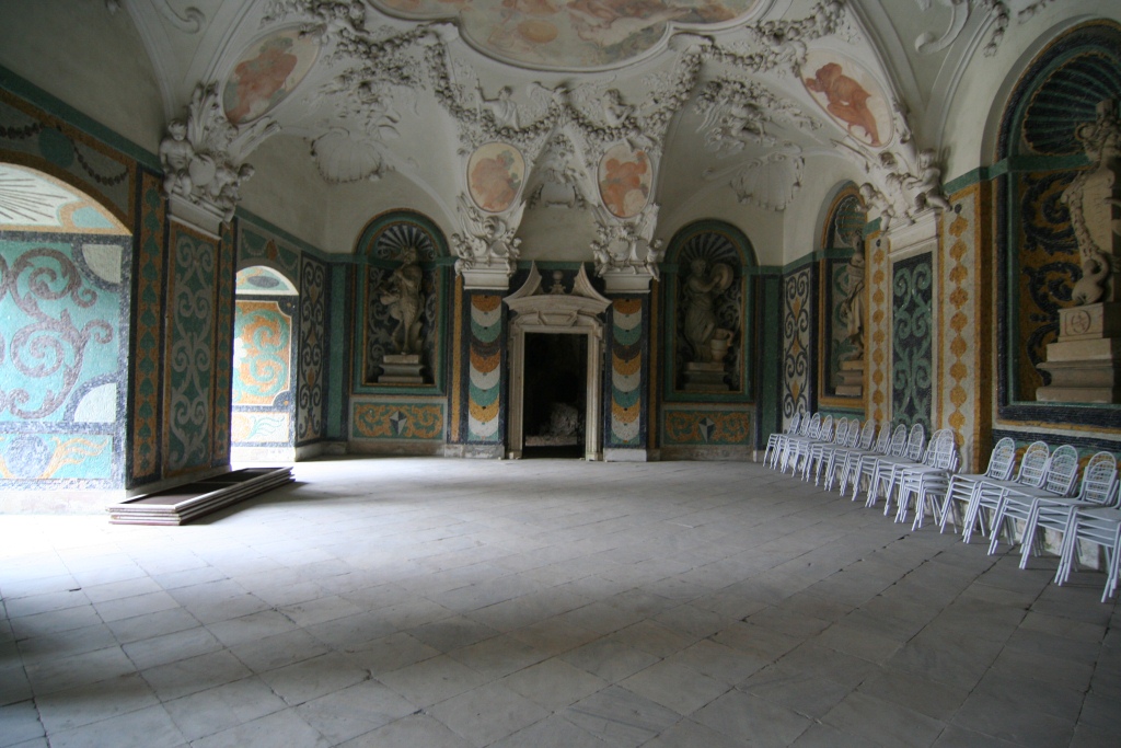 Nejméně přestavěnou částí je přízemí, obrácené do podzámecké zahrady, těžce poškozené při povodních v devadesátých letech. Sala terrena je tvořena sály a umělými grottami s krápníky, mušlemi a vodními hříčkami a přírodními útvary, sochařskou výzdobou a freskami na stropech – účast architekta Pietra Tencally. Prostory byly určeny pro hudební a divadelní produkce v kontextu se skutečnou přírodou zahrady.