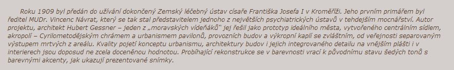 Roku 1909 byl předán do užívání dokončený Zemský léčebný ústav císaře Františka Josefa I v Kroměříži. Jeho prvním primářem byl ředitel MUDr. Vincenc Návrat, který se tak stal představitelem jednoho z největších psychiatrických ústavů v tehdejším mocnářství. Autor projektu, architekt Hubert Gessner – jeden z „moravských vídeňáků“ jej řešil jako prototyp ideálního města, vytvořeného centrálním sídlem, akropolí – Cyrilometodějským chrámem a urbanismem pavilonů, provozních budov a výkropní kaplí se zvláštním, od veřejnosti separovaným výstupem mrtvých z areálu. Kvality pojetí konceptu urbanismu, architektury budov i jejich integrovaného detailu na vnějším plášti i v interierech jsou doposud ne zcela doceněnou hodnotou. Probíhající rekonstrukce se v barevnosti vrací k původnímu stavu šedých tonů s barevnými akcenty, jak ukazují prezentované snímky.