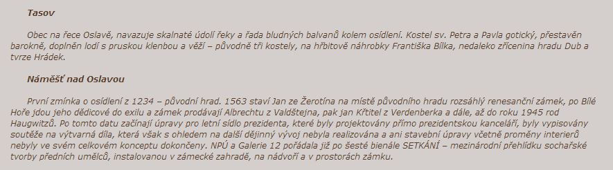 V prezentaci jsou uvedena jen základní data k jednotlivým lokalitám, podrobná info jsou k dispozici pod titulem Památková péče 013 2 v prezenční výpůjční službě knihovny Vysoké školy uměleckoprůmyslové v Praze – www.vsup.cz