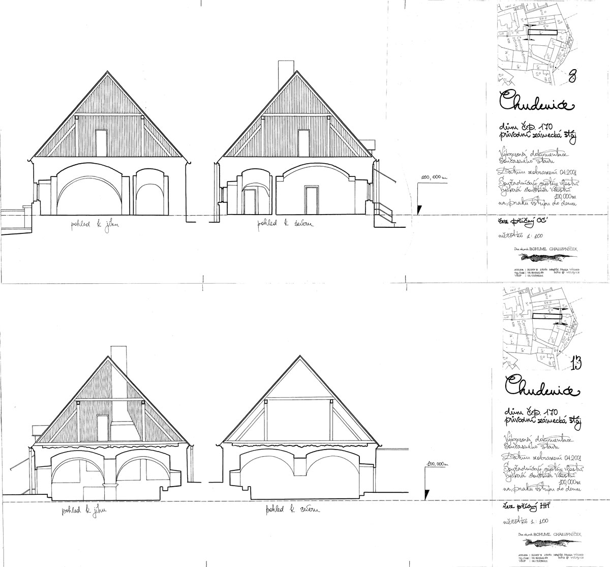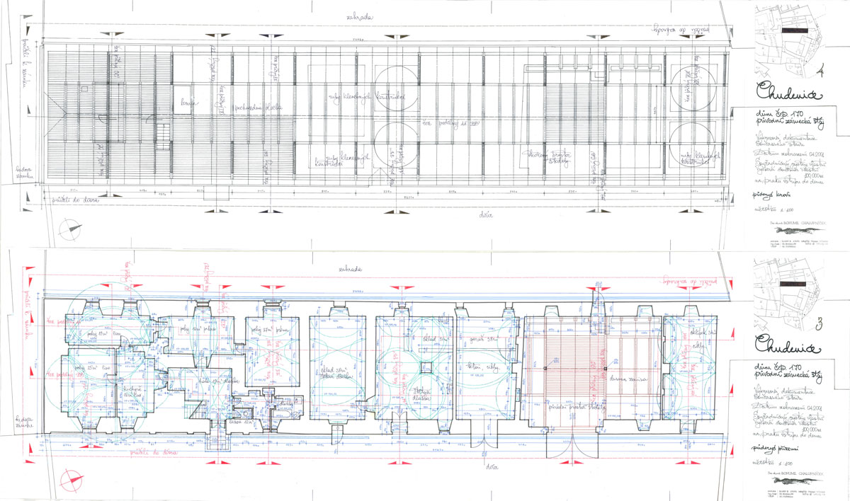Stavební monoblok hospodářské usedlosti s prostory určenými pro obývání měl pro vytvoření výkresové dokumentace jednoduchý půdorys svého objemu. Složitá vnitřní dispozice si však při pracích v terénu vyžádala geodetické postupy s náročnou kresbou polních náčrtů, zobrazujících nepravidelnosti půdorysné i četné klenebné konstrukce