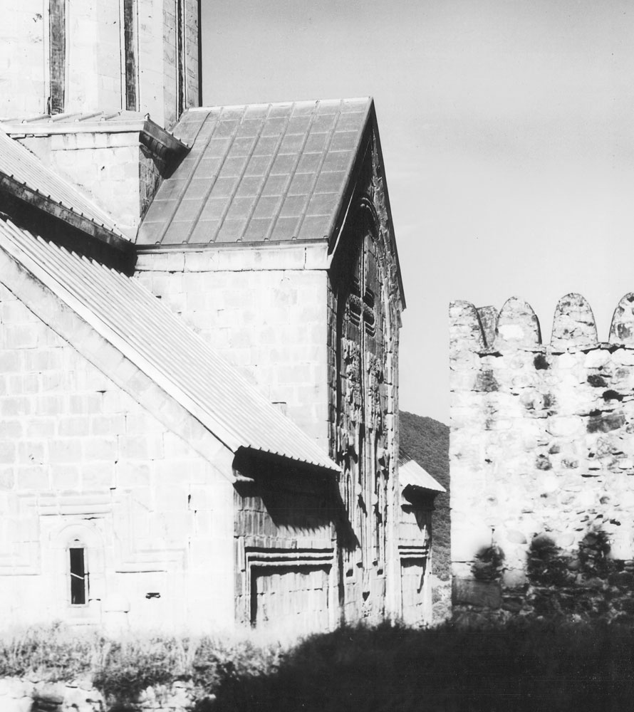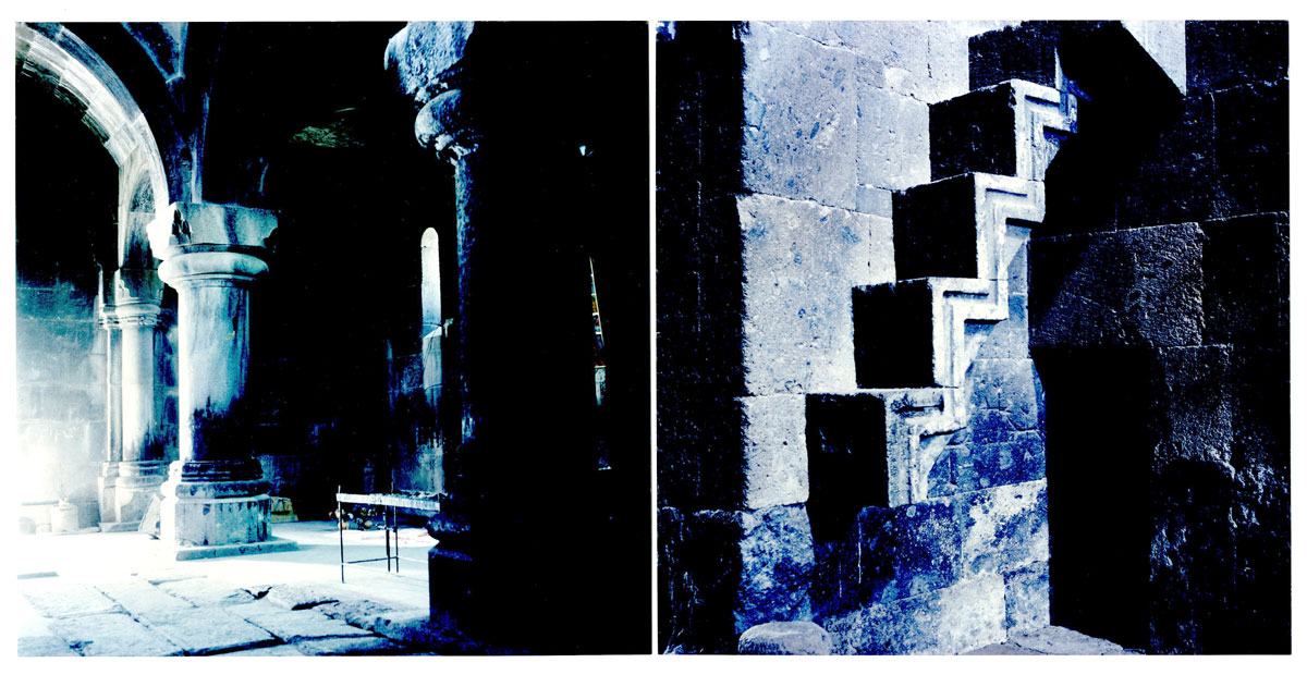 Hlavním stavebním materiálem byl od dávných období v Armenii sopečný tuf. Porezní, dobře opracovatelný kámen, který vznikl z původního sopečného popela. Prakticky nepodléhá erozi a má vynikající tepelně izolační vlastnosti. Stáří budov, které si po staletí zachovávaly svoji formu i detail, lze rozpoznat právě podle skladby šedých a růžových kvádrů, které se k mladším obdobím začaly kompozičně skládat do pruhů a obrazců na rozdíl od náhodné skladby v obdobích starších. Kláštery plnili i obrannou funkci, jejich dispozice je zcela odlišná od evropských klauzur, rajských dvorů a klášterního chrámu. Masivní fortifikovaný stavební monoblok těchto arménských staveb takovéto členění nedovolil a tak jsou cely mnichů rozptýleny po celé stavbě včetně dutin v kupolích chrámů, kam vedou kamenná schodiště. Dodnes se těchto klášterů dochovaly stovky, podle francouzských pramenů, které jsme měli na cestě k dispozici, jich bylo původně přes dva tisíce, řada z nich stojí na dnešním tureckém území. bch