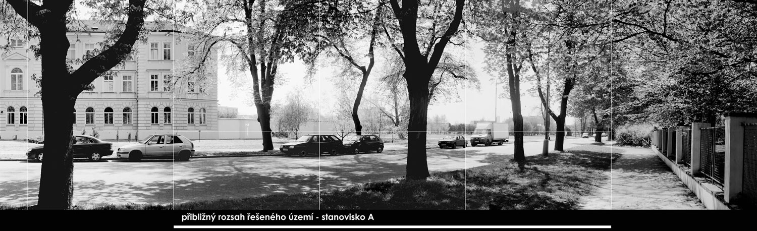Tři vybrané pohledy nezobrazují proto pouze vlastní řešené území stavebního pozemku, ale stávající okolní konfiguraci budov a vzrostlé zeleně v širokém panoramatickém úhlu zobrazení. Takovýto úhel není možno obsáhnout jedinou rozšířenou průmětnou a proto je celkový záběr složen z více snímků - samostatných perspektiv, vzájemně na sebe navazujících shodnou distancí, úhlem zobrazení a výškou horizontu. Šíře jednoho dílu fotografického snímku se rovná ve výkresovém podkladu šíři příslušného úseku perspektivní průmětny, výška horizontu perspektivy je vykreslena linií přímo ve fotografii, stejně jako průmět hlavního paprsku v ose fotografie.