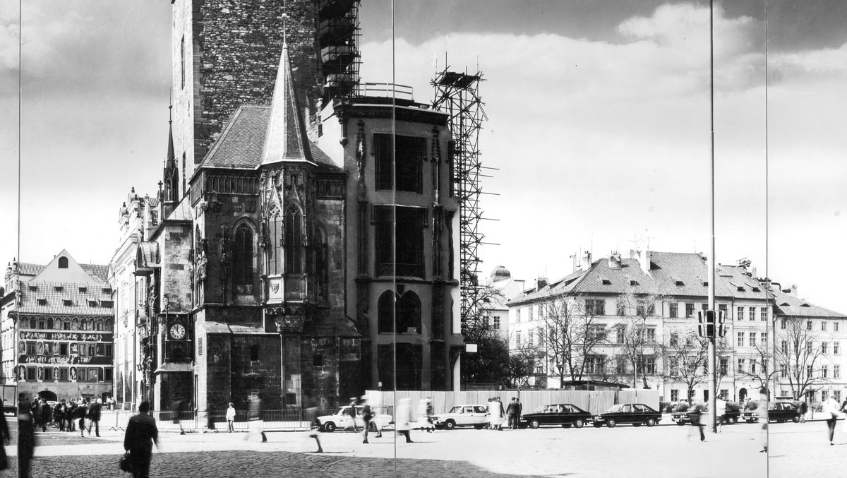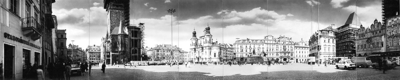 Staroměstské náměstí se zřejmě konečného řešení budovy radnice, kterou město de facto ani provozně nepotřebuje, v blízkém časovém horizontu nedočká. Přes to však jsem byl osloven k vytvoření dalších, poměrně rozsáhlých panoramatických zobrazení tohoto výlučného prostoru. Důvod byl však mnohem prozaičtější, než předchozí zmiňovaný historický problém. Restaurace Kříž – Lažan, která dodnes nese svůj vžitý název Staroměstská restaurace, chtěla expandovat do prostoru náměstí svým sezonním letním provozem venkovních stolků, židlí a slunečníků. Tehdejší Útvar hlavního architekta hlavního města Prahy však požadoval na provozovateli zobrazení budoucího stavu náměstí s uvedenou kapacitou počtu míst. Bylo ve hře hodně peněz. Sezona byla již dalece v běhu a poptávka po restauračních službách v místě a v tehdejší turistické explozi po revoluci zdaleka převyšovala nabídku. Zároveň byly poměrně astronomické ceny za pronájem veřejné plochy, které se tímto zdržením dostávaly do mínusu. Elaborát musel být vytvořen v rekordně krátkém čase. Navrhované zařízení bylo již zakresleno tehdy jednoduchými lineárními systemy autocadu, výsledná kresba a instalace do fotek byla dokončována ručně. Obsazení stolků lidmi se vypůjčilo z mých panoramat benátského Lungo mare, couvert na stolcích byl dokreslován, vše bylo fotografickou cestou znovu reprodukováno. Přes značné peripetie, které měl provozovatel i po dodání tohoto materiálu, se nakonec povolení dočkal. Dnes je venkovní stolničení a to nejen před touto restaurací samozřejmostí. Je tak tomu i ve světě, v Itálii především. Mnohá náměstí tam nesou takový tržní nebo restaurační program, že je ani nevnímáte, za to však nakoupíte nebo se vynikajícím způsobem občerstvíte. Názor konzumenta a architekta se samozřejmě může lišit. bch